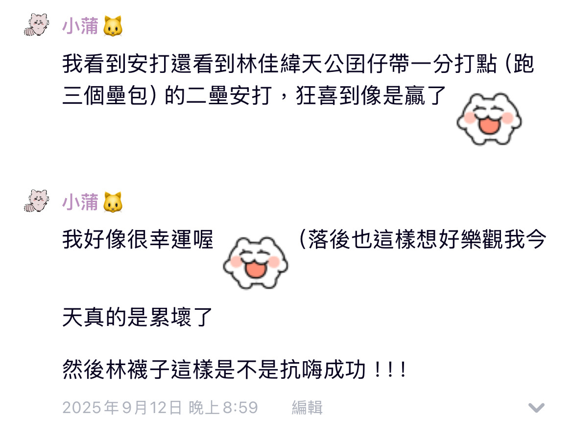 「今日喵迷狀態:能安打就算贏→能得分就算贏→九局有點反應就算贏→啊不是怎麼真的贏了」