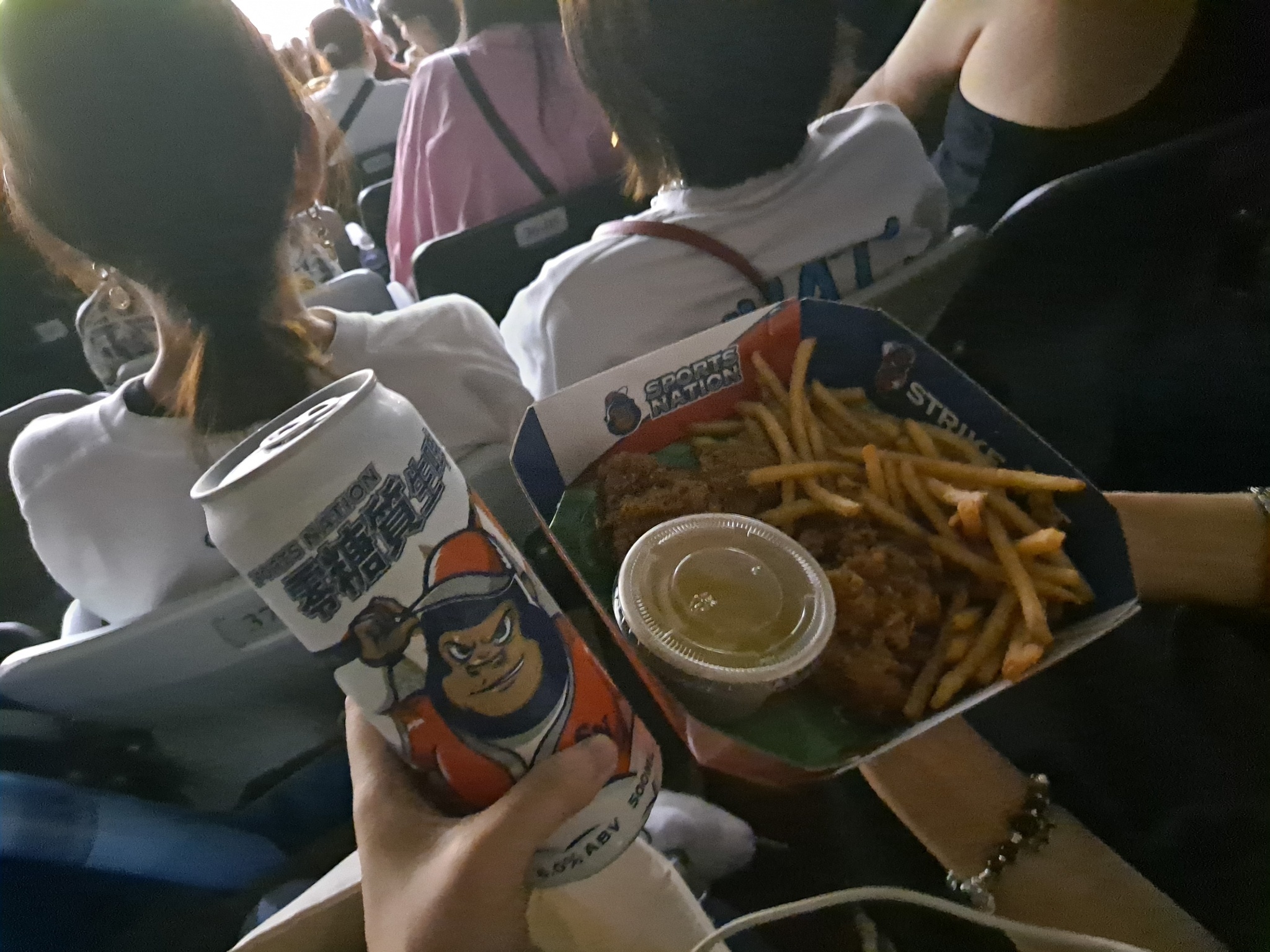 後來因為我幾乎整天跑行程沒怎麼吃東西,只吃了一顆御飯糰我餓了😂旁邊日本妹子又翻出去買吃的,三局下半得兩分我就跟朋友說等這局結束我要去買吃的,結果樂天打線直接全開,每一球都打安打,瘋狂得分,6分的時候旁邊日本人回來了薯條有夠香炸雞!結果打到8分的時候,我真的在想要不我先去買吧,還是要看完啊很猶豫,終於結束了🤣回來已經過了三局完全沒得分,跑去買了炸雞薯條配啤酒,但是我又吃不完跟朋友兩人分剛剛好,但是因為我其實沒睡飽,啤酒喝下去,頭開始好暈啊