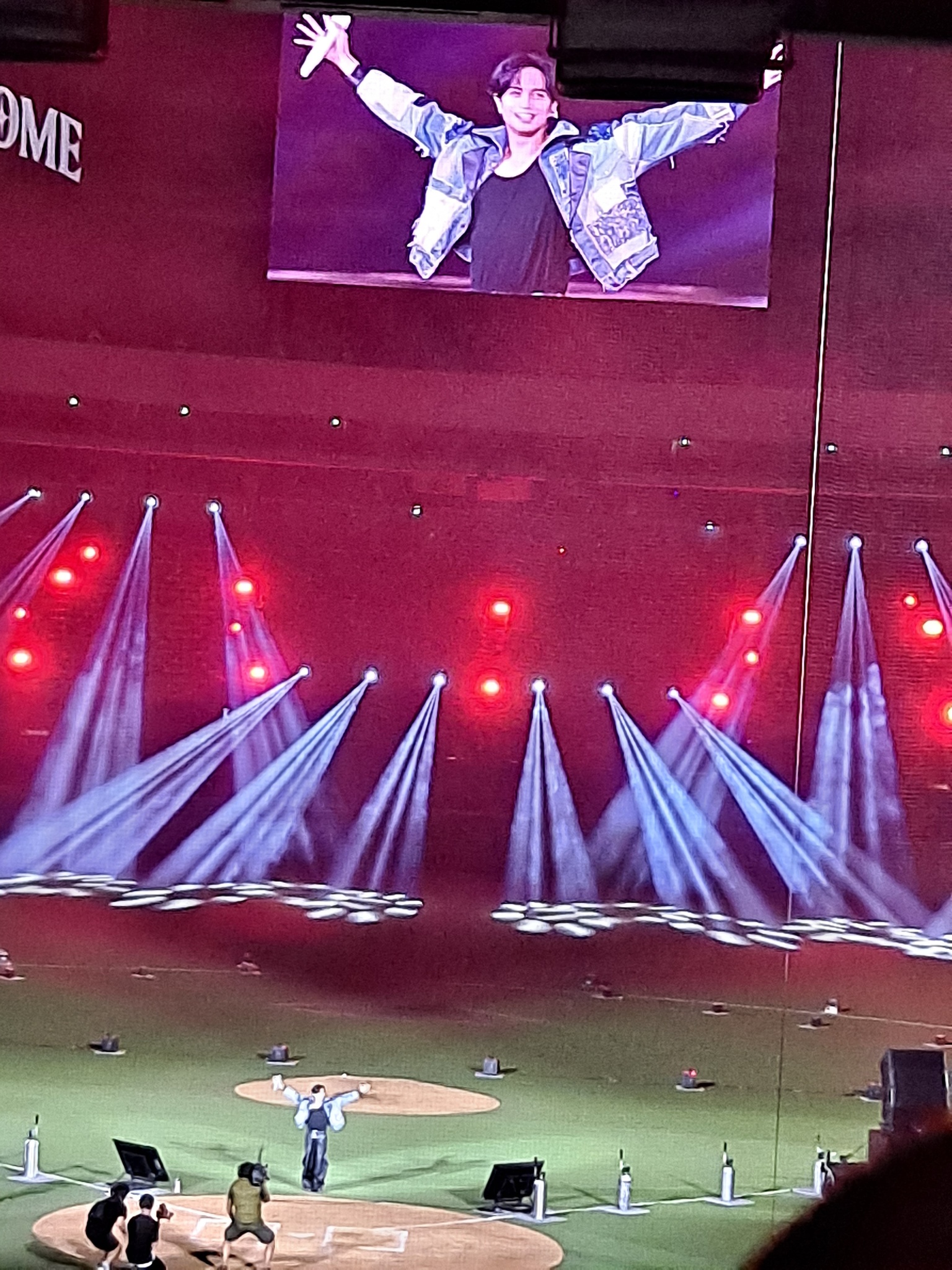 尤其好多日本人因為聽不懂看不懂純粹來看中島,前面本來很多空位,最後都來了🙃起點超高(不是w,全場超級嗨,而且應援聲超大聲嚇到了因為我啥都拍不到,所以就拍螢幕配小人,藍色外套出場,後來換成樂天衣服,唱了幾首好嗨,應援真的超級大聲,後面車車繞場一圈,還丟飛吻✨️不愧是愛豆魯♡