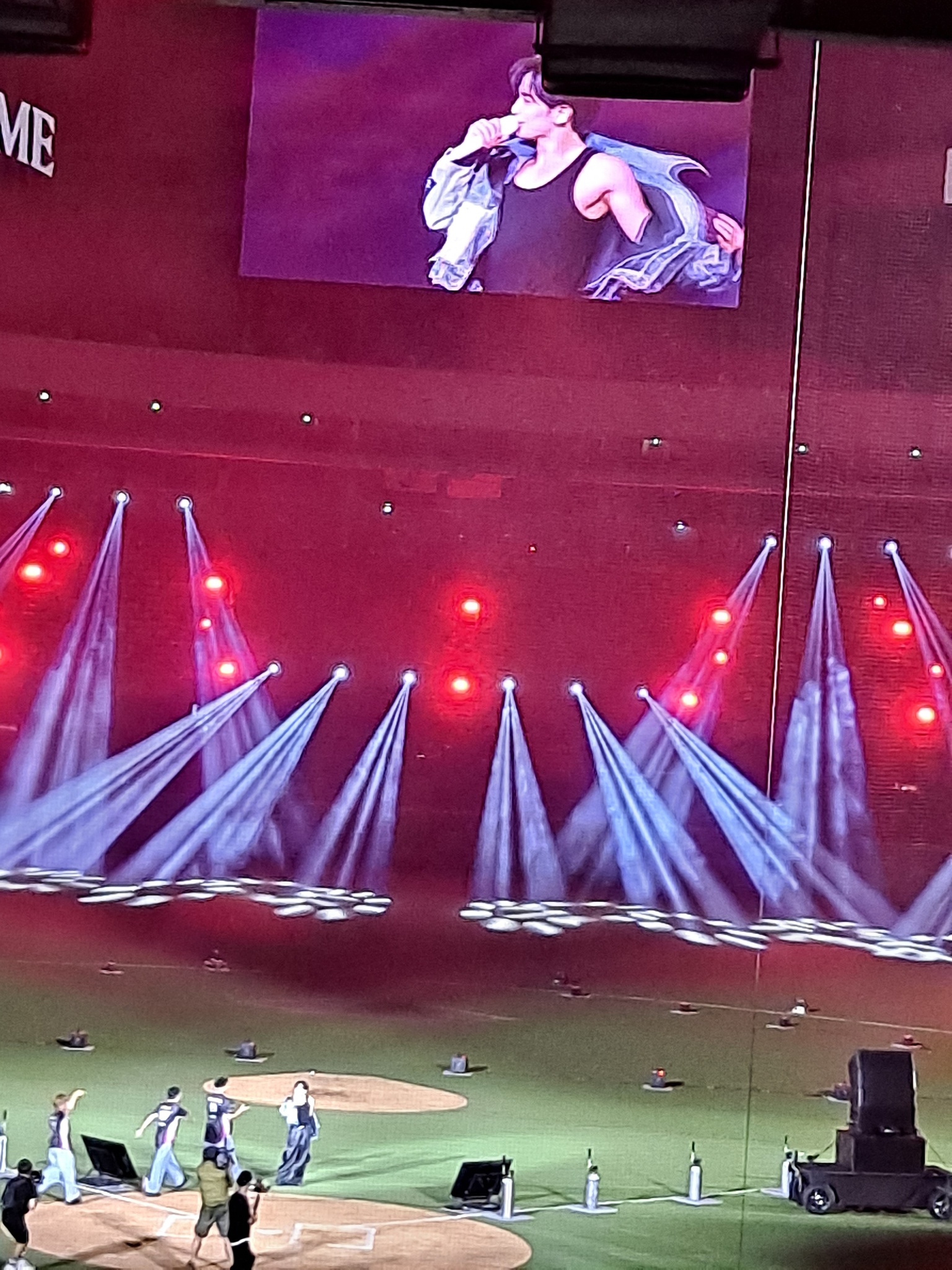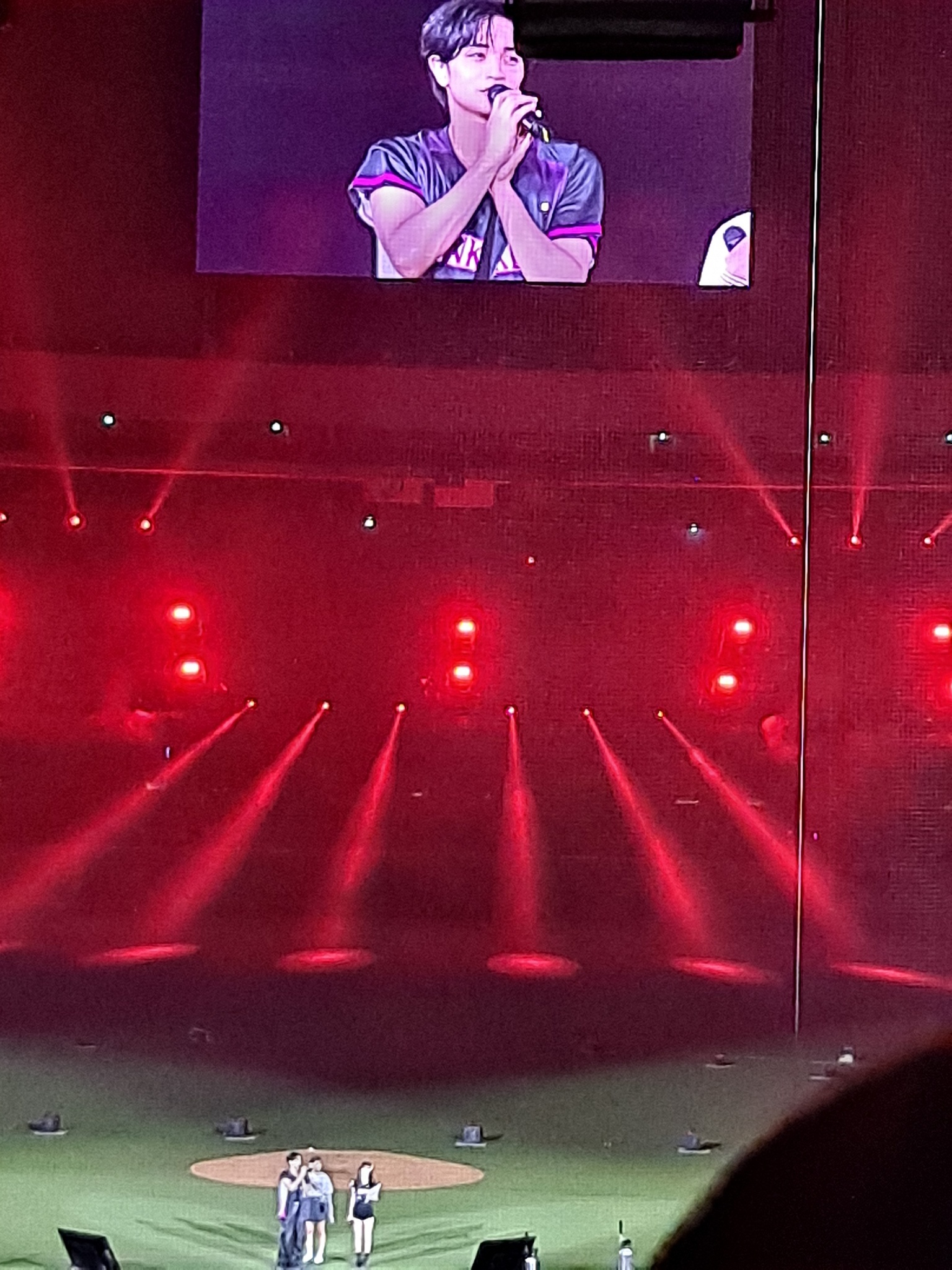 因為我啥都拍不到,所以就拍螢幕配小人,藍色外套出場,後來換成樂天衣服,唱了幾首好嗨,應援真的超級大聲,後面車車繞場一圈,還丟飛吻✨️不愧是愛豆魯♡