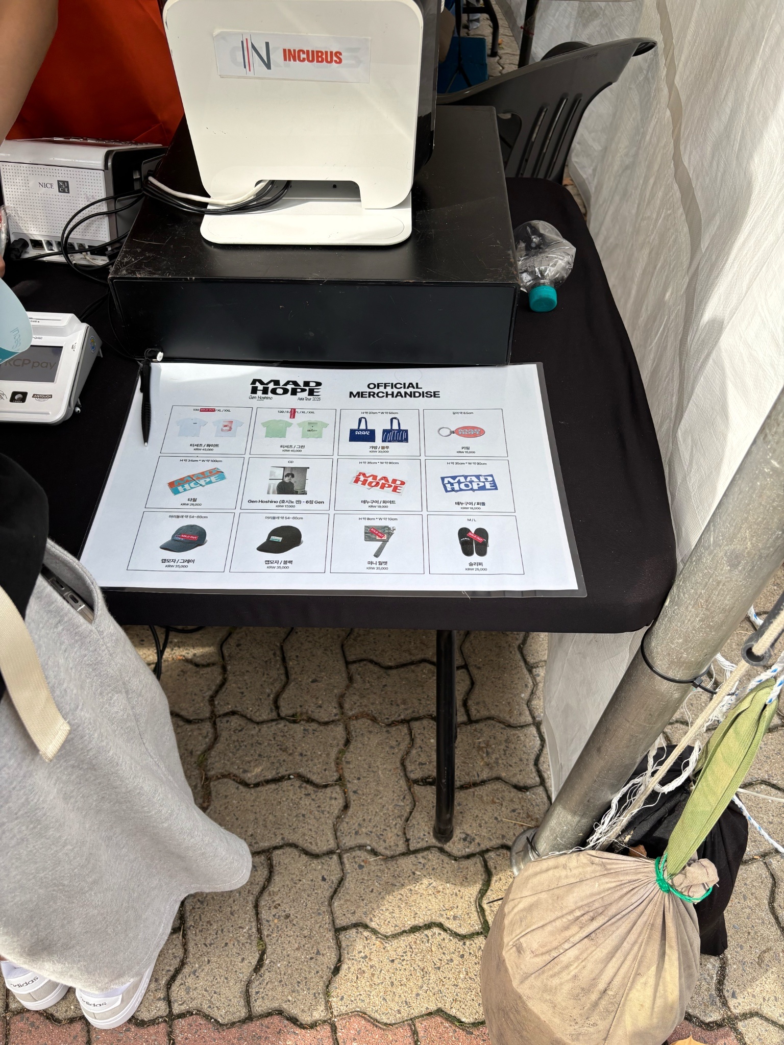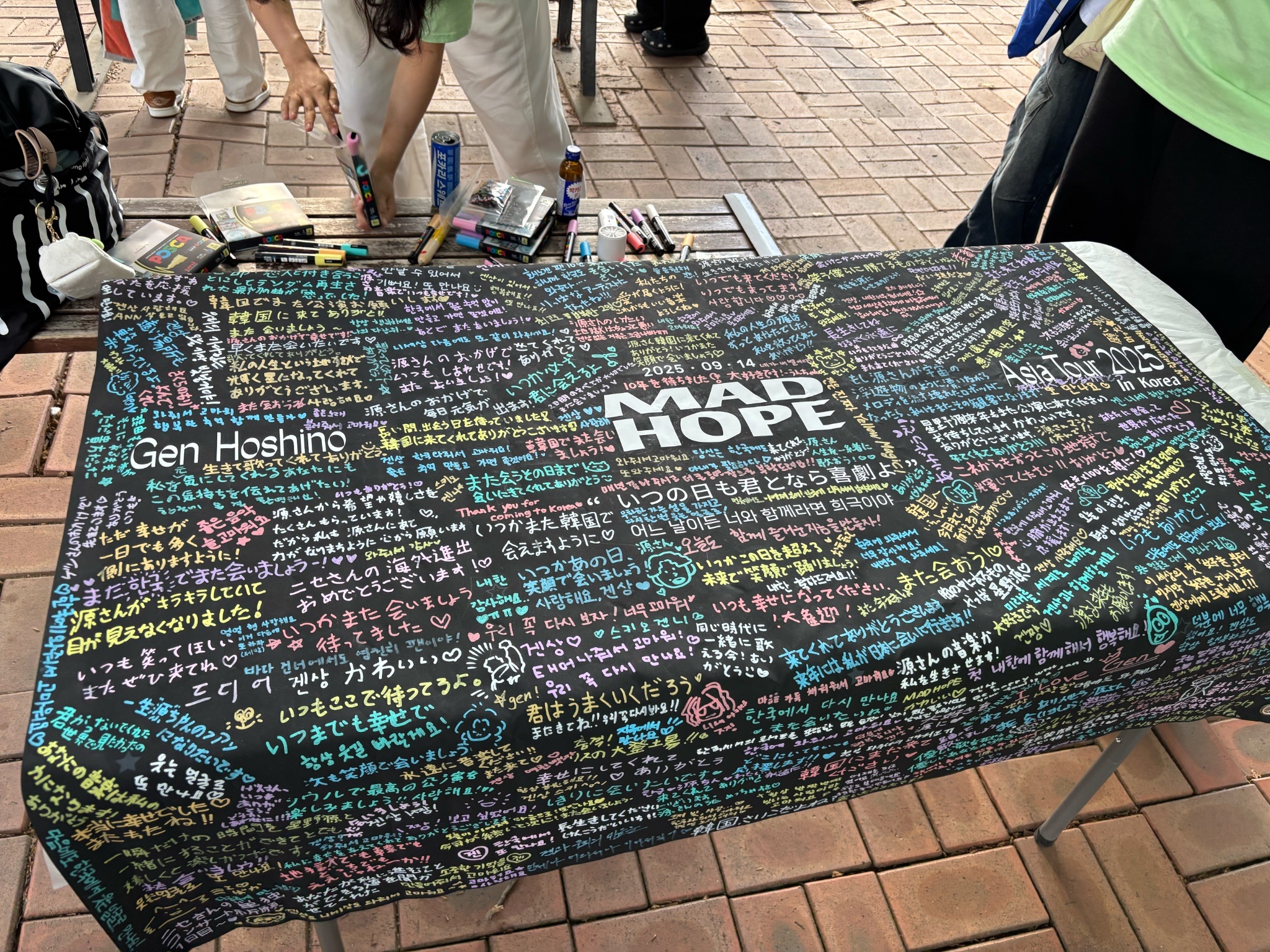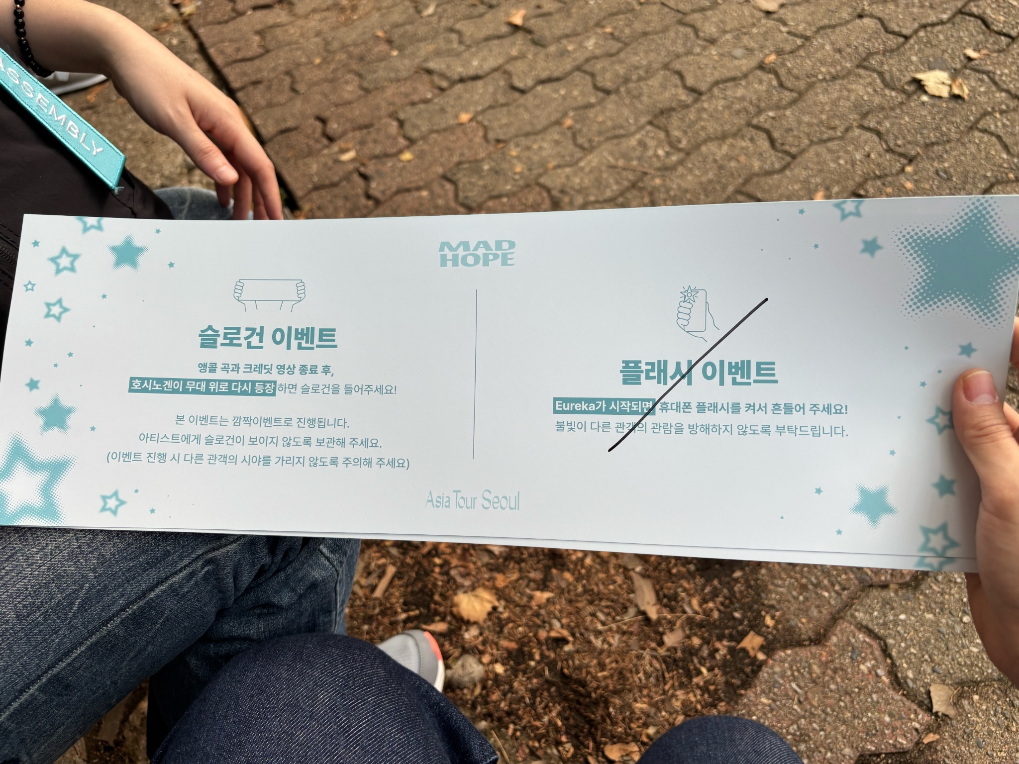 然後從接近場地區域就看到有人在發一張MADHOPE藍色的大張紙,因為都是說韓文,就沒有接近;找座位待機的時候看到發送的本部(?),他們不知道從哪裡借?帶來兩張長型摺疊桌,上面放那個紙跟兩大本很像是收集冊的東西。實在是很好奇,所以去靠近本部,路上被發放紙的大E人粉絲遞了紙