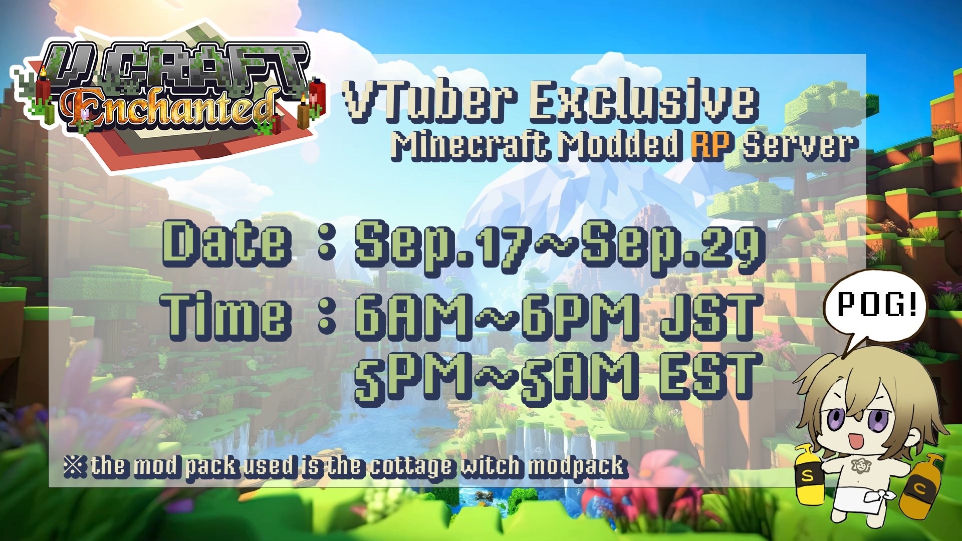這個伺服器只會在9/17-9/29的每天5點到17點開放,參與人員以英語圈Vtuber為主,並且需要進行角色扮演,除此之外這個mod有著學習咒語施展魔法、製造藥水、烹飪料理、魔法道具、動力機械、豐富的動植物生態敵人戰利品和最重要的任務引導書等特色,即使是初次遊玩,也能依循著任務指示發展興趣與專長!