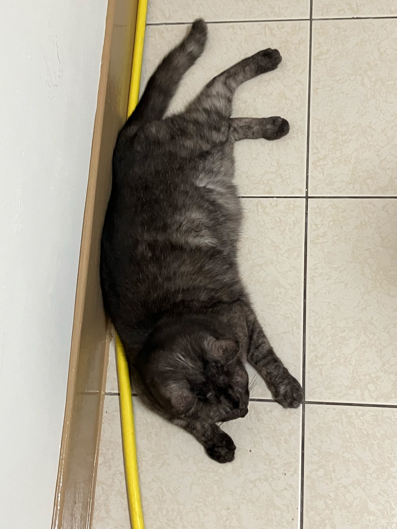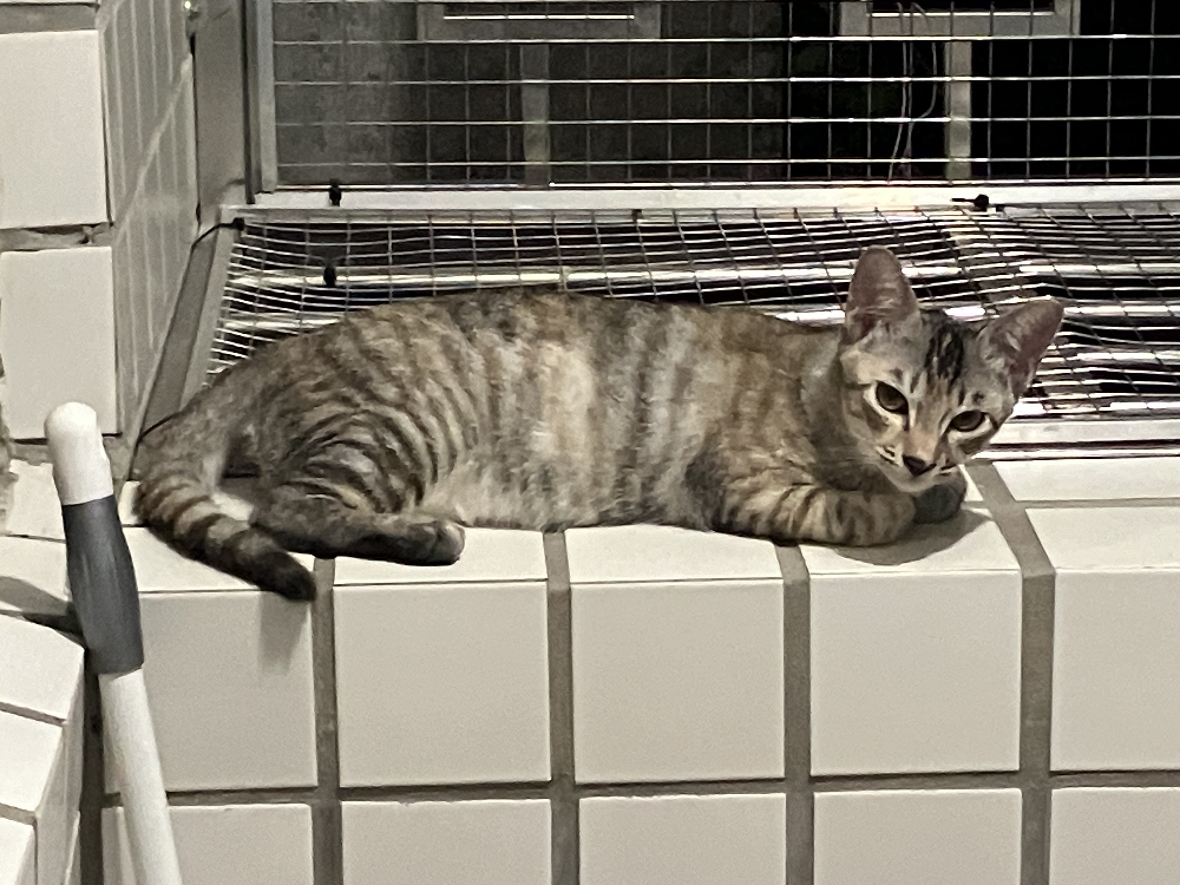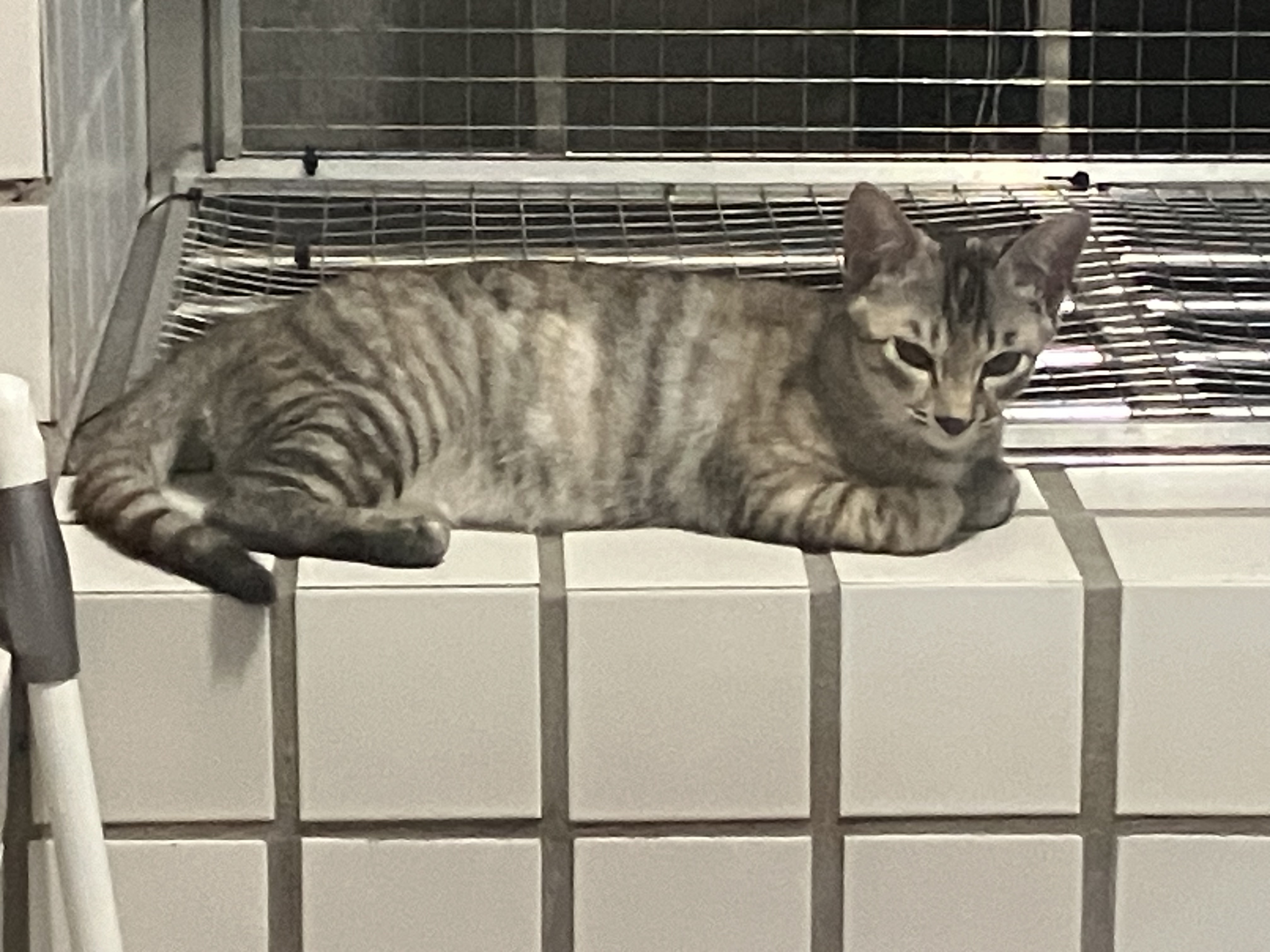 貓二擺出折手手但後腳重疊的姿勢睡在後陽臺矮牆上
