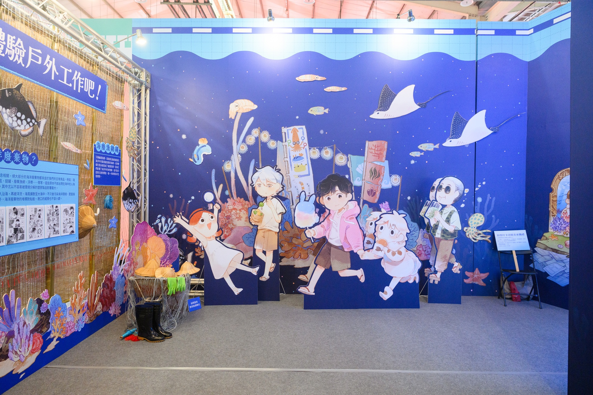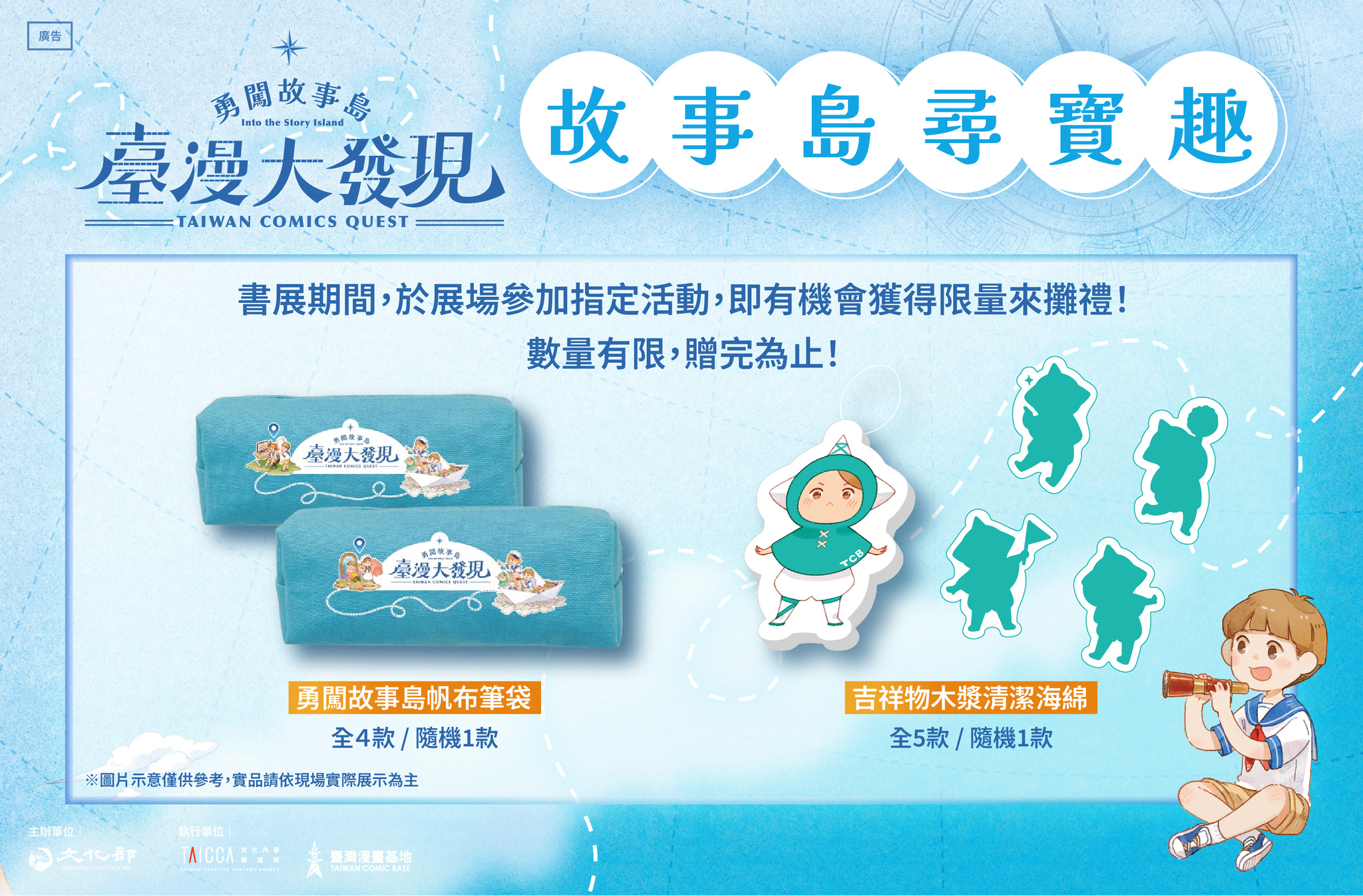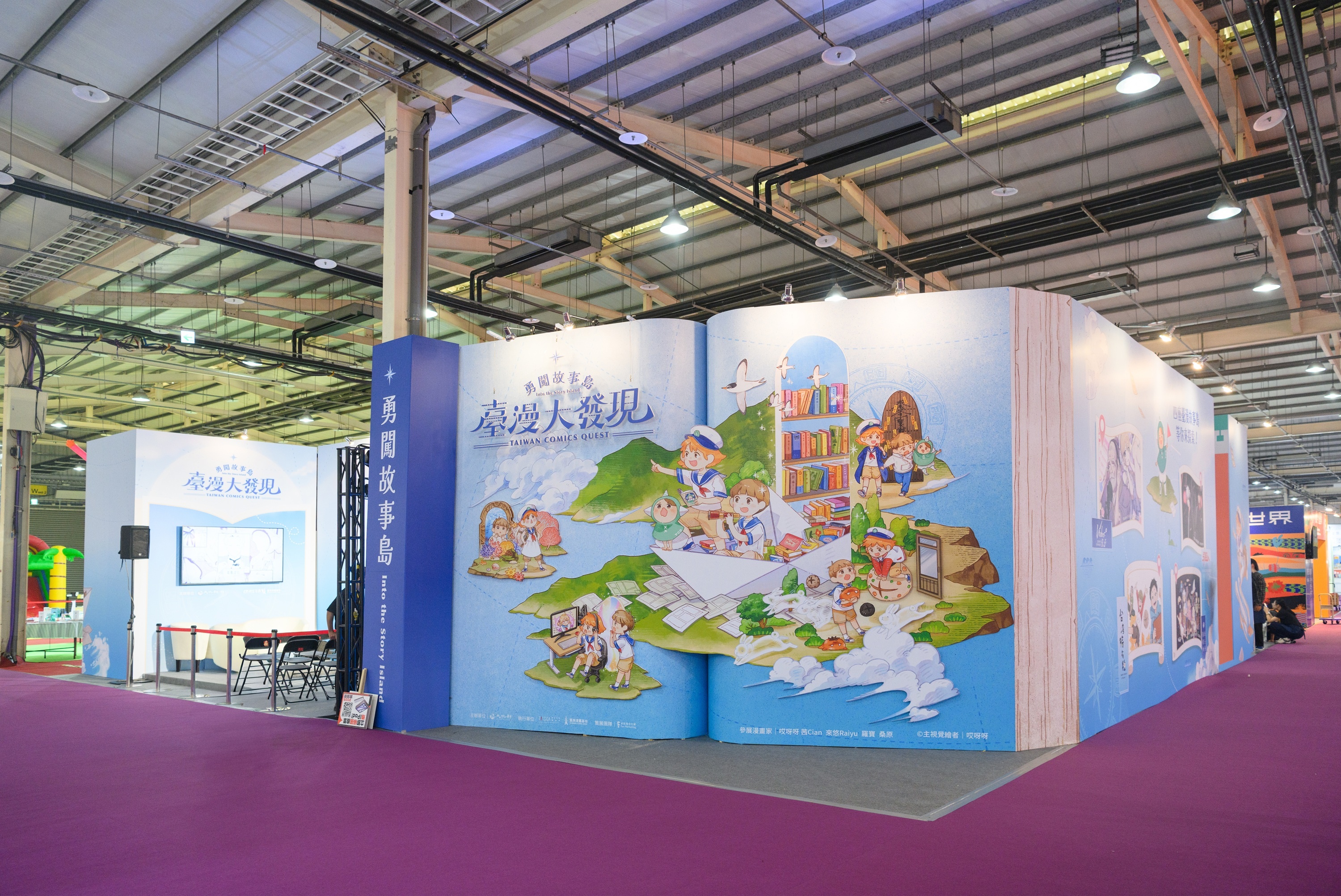 以「臺漫大發現.勇闖故事島」為主題,透過《海巫事務所》、《台灣特有種》、《Vtuber孔子》、《引路人》四部作品規劃多元互動展區引領兒少探索原創臺漫!