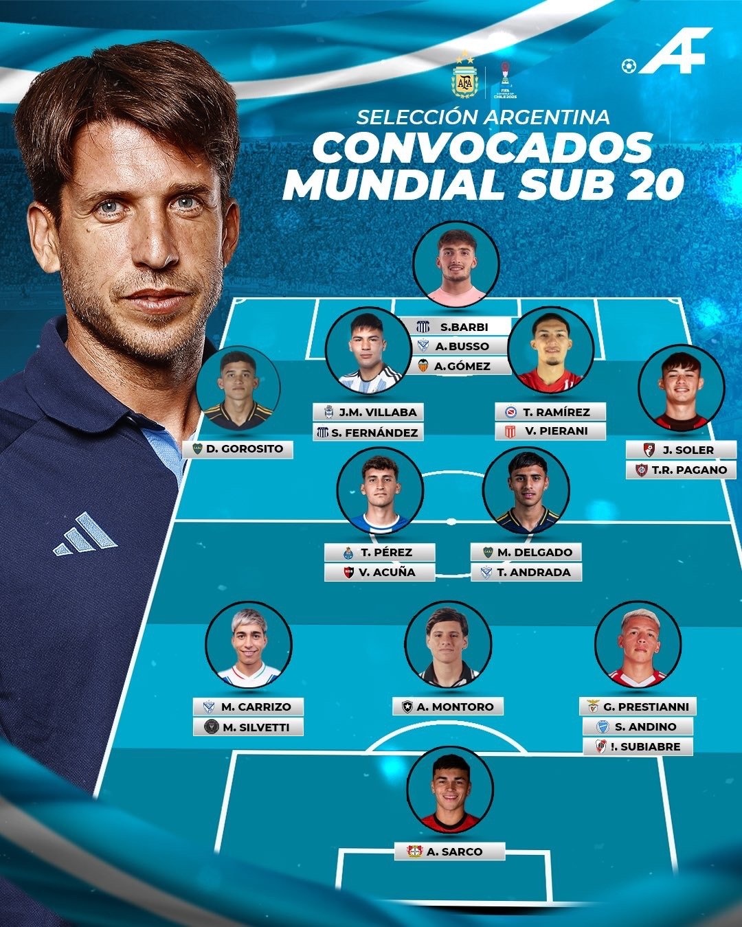 對於即將於九月27日到十月19日舉行的 Copa Mundial Sub-20 de la FIFA Chile 2025 (2025年智利20歲以下世界青年足球錦標賽),阿根廷 Sub20 國家青年隊總教練 Diego "El Viejo" Placente (普拉森特) 公佈了參賽名單,總共有21名球員入選.