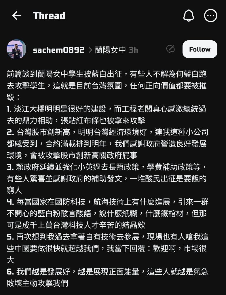 前篇談到蘭陽女中學生被藍白出征,有些人不解為何藍白跑去攻擊學生,這就是目前台灣氛圍,任何正向價值都要被摧毀