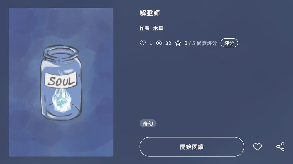 心得:目前2萬多字感覺沒寫完(狀態是連載中),看了序章(有兩篇)對於作者描述的這個「解靈師」的職業滿感興趣的,簡單說就是幫忙完成靈魂生前執念的一種職業,但對於作者描述的那個工作的空間我很感興趣,是個像圖書館一樣被大量的書櫃包圍的一個小空間,和一台會自己打字(Key出委託人委託)的打字機,隱藏在書櫃後的另一個空間放著各式各樣的罐子這點我也曾幻想過,看到有人寫出來有種異樣的滿足感~