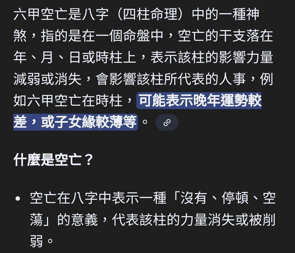 在弄原創骨科兄弟的劇本,因為正好他們兩個的生日都有設定精確到幾點幾分,想說看一下他們八字重量,可以寫點鬧鬼劇情之類的。結果查的網站直接把命盤都給了,就加減餵狗了解一下命盤上的名詞是什麼意思。……結果表弟命盤中有『六甲空亡』一查,我整個大爆笑:對對對,他是骨科他還是gay,子女什麼,沒有,不會有,就空亡沒錯沒錯👍🏻👍🏻👍🏻