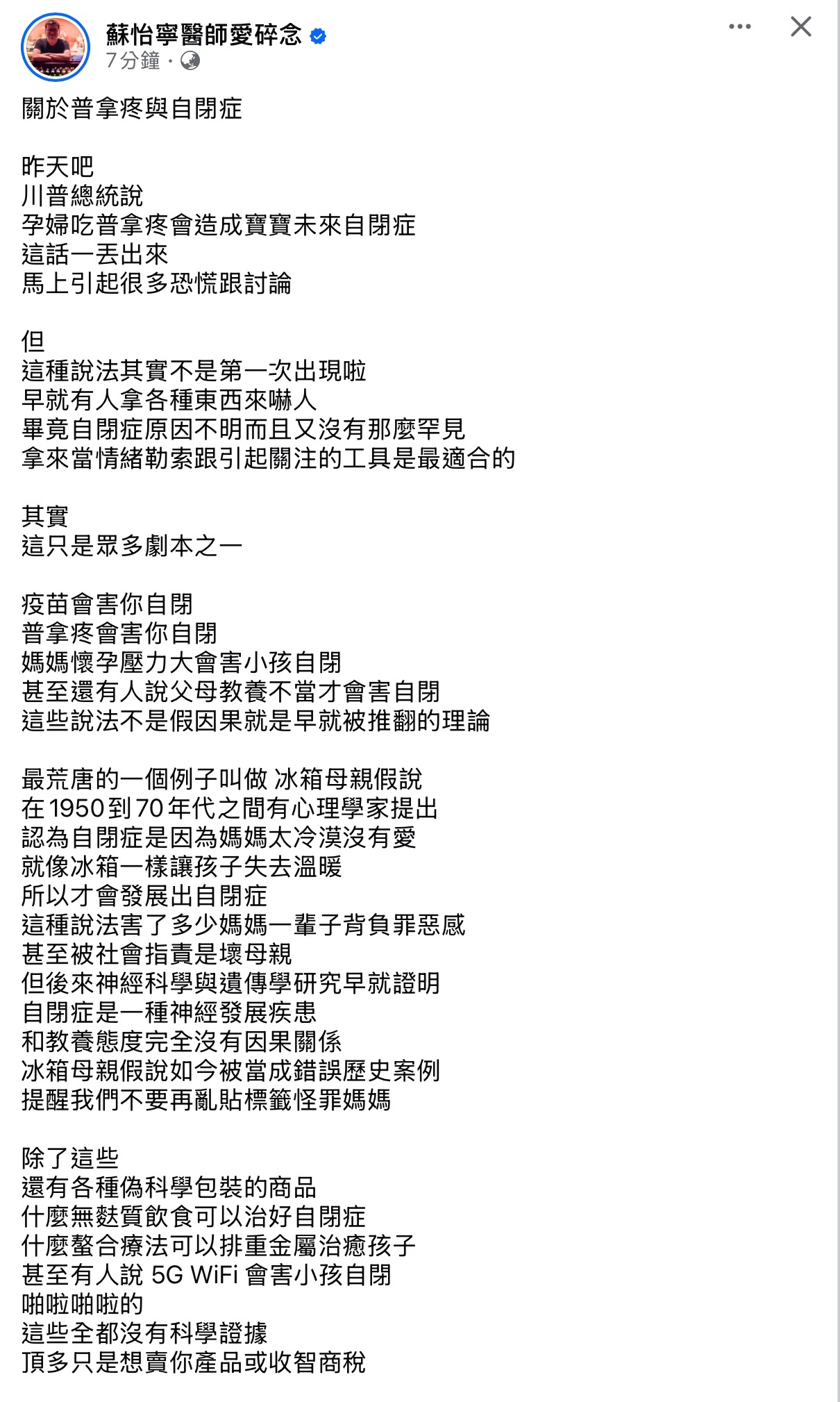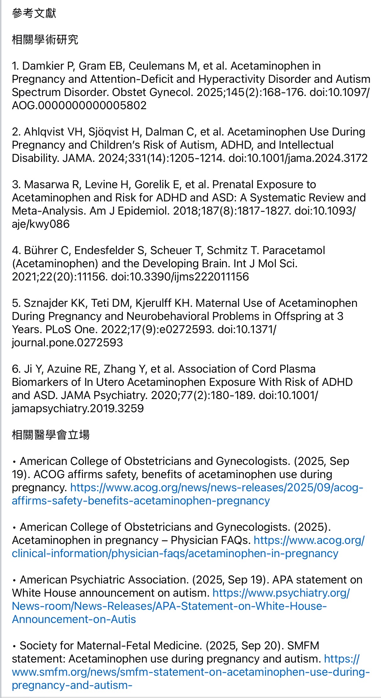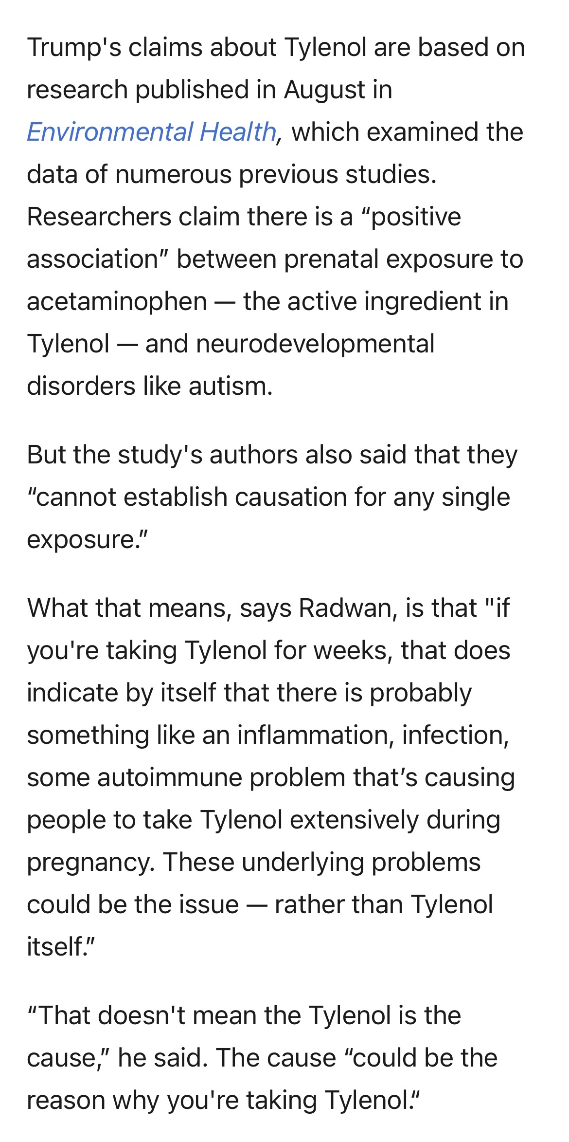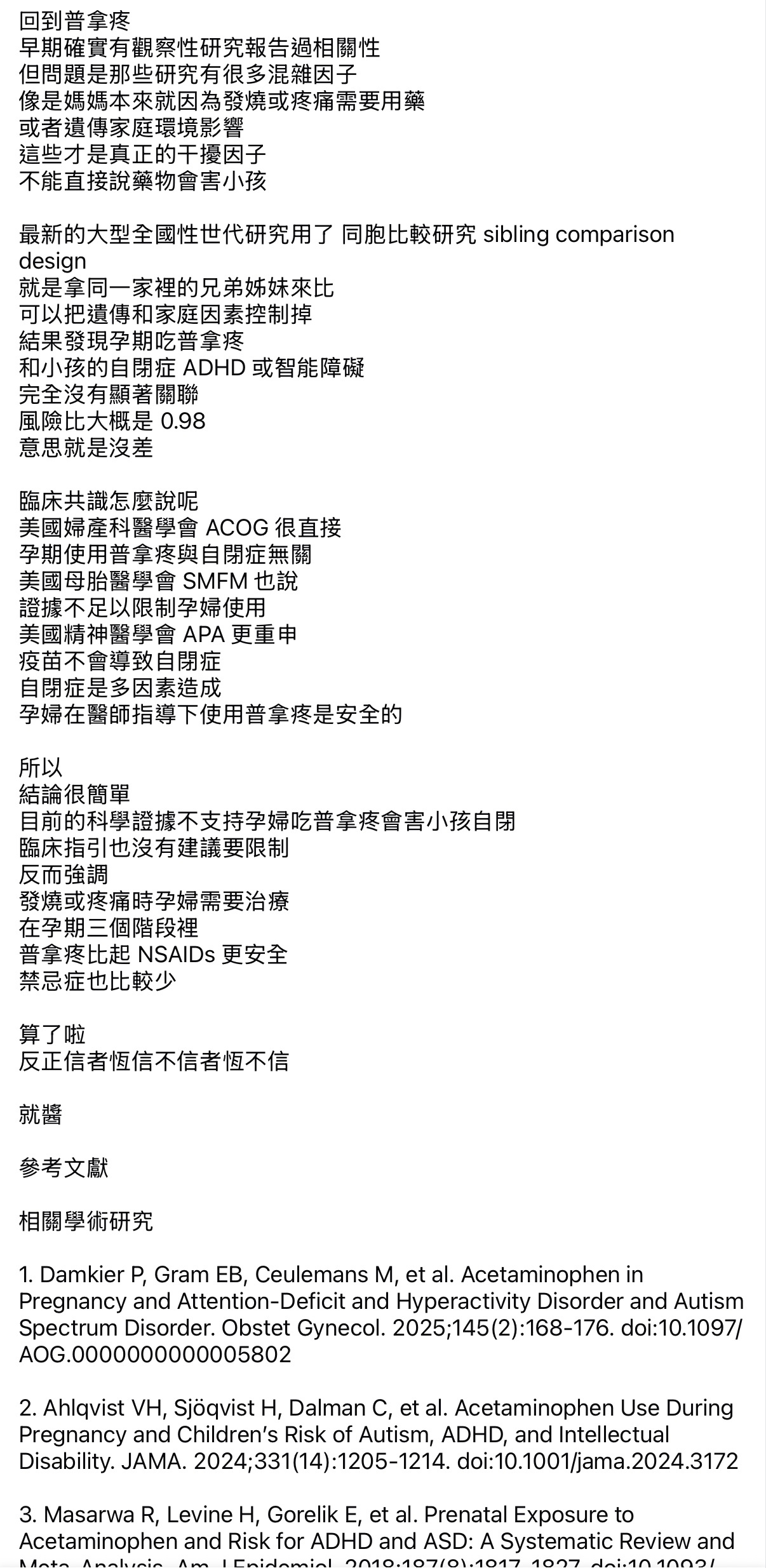 : 川普引用的文章的作者自己都說可能不是因為乙醯胺酚,而是孕婦如果有需要長期吃乙醯胺酚,是因為她有長期發炎/發燒症狀,引起那症狀的疾病或感染可能才是主因(通常需要長期吃,醫生比較不會開NSAIDs,會胃潰瘍)