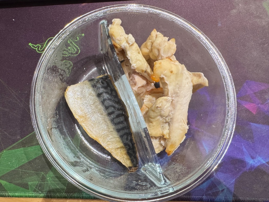 今天午餐覺得自己會吃不下,所以只弄了一樣份量的雞里肌肉+鯖魚,沒有水煮菜,結果還是一樣吃不下,中間休息好幾次才勉強吃完