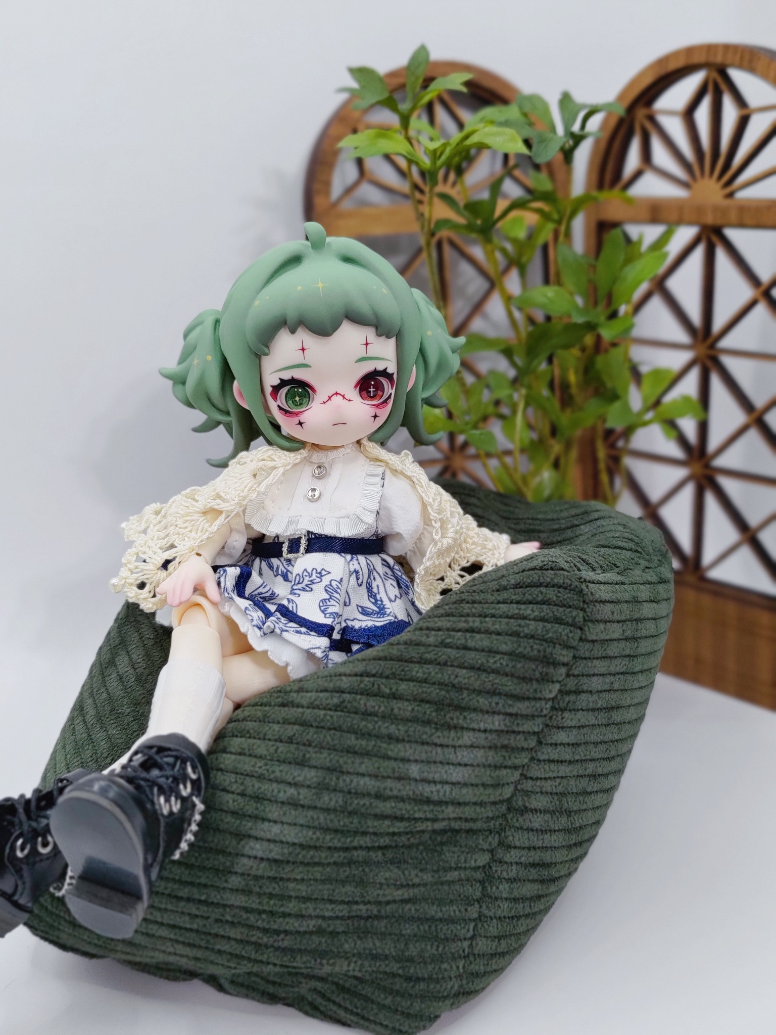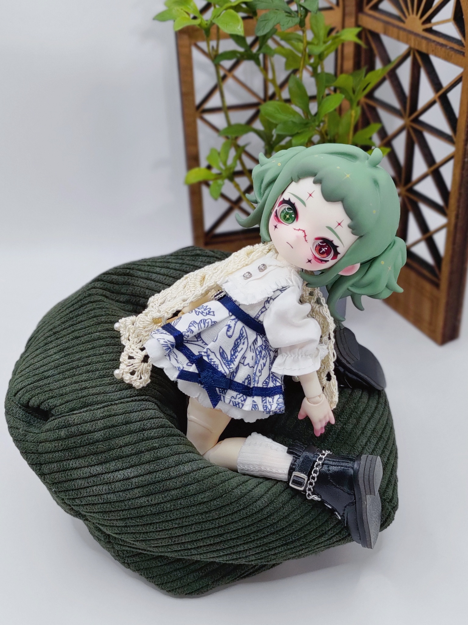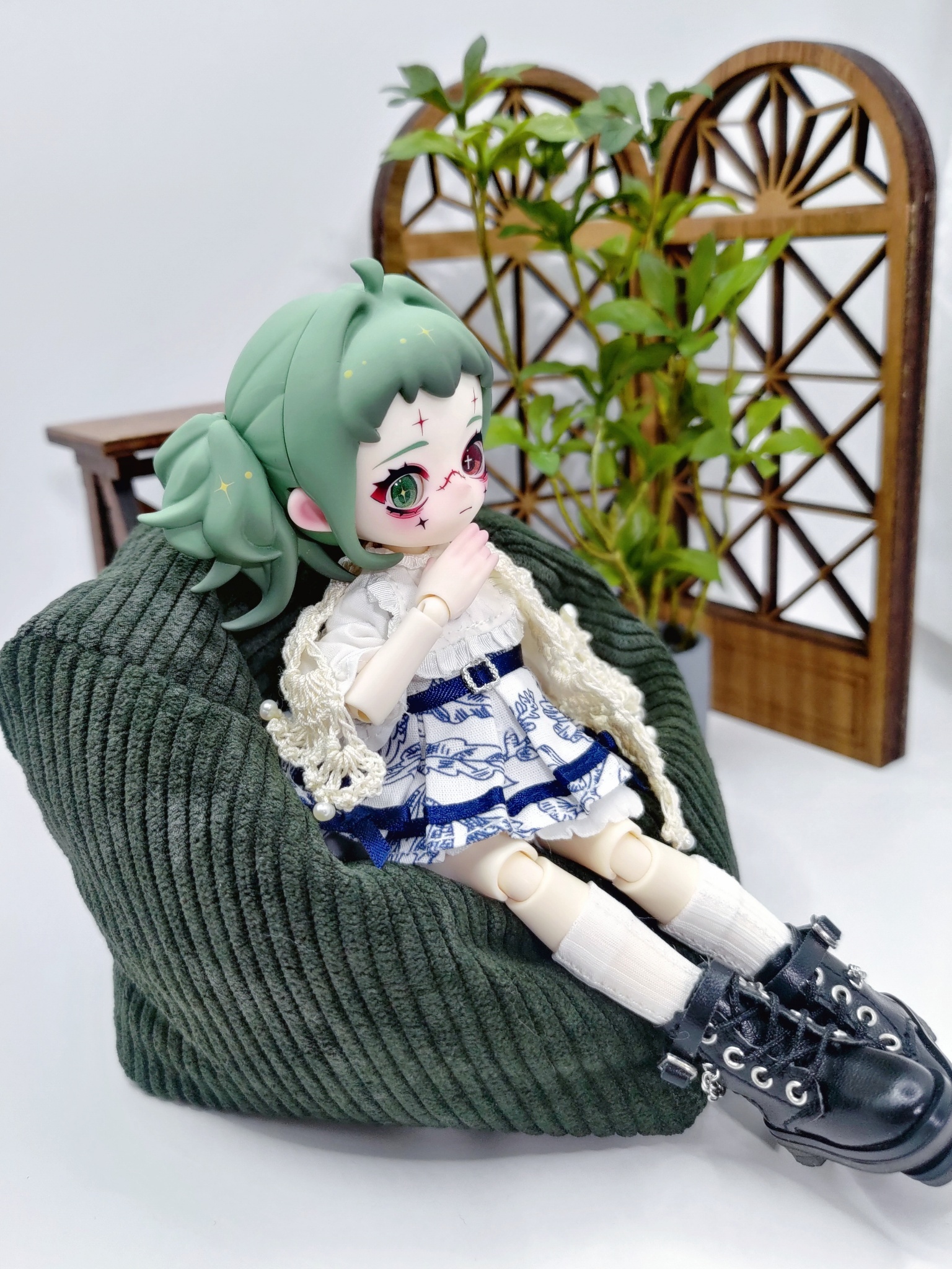 沒有適合的綠色系服裝所以用了帶有深藍色花紋的裙子做搭配,感覺應該也不錯吧