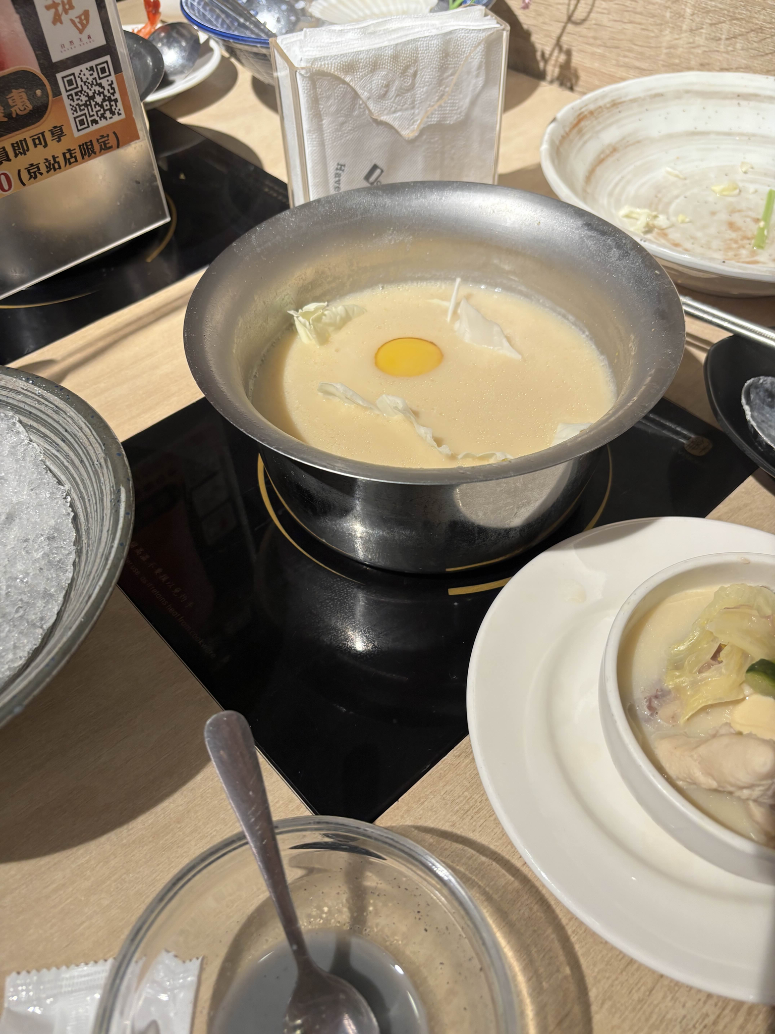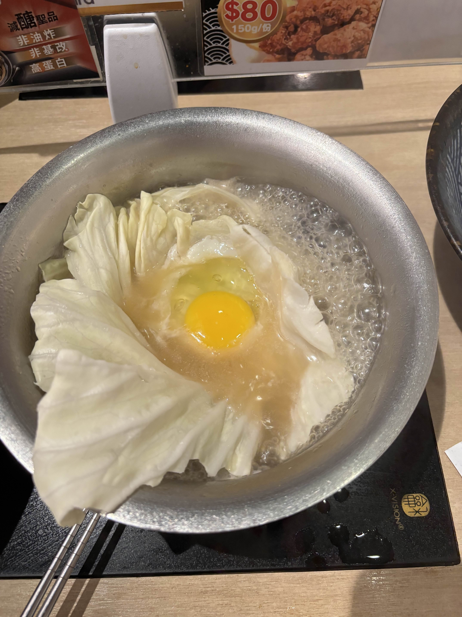 看完結婚和朋友回到京站吃鍋,用了在網路上看到的高麗菜打蛋法,原本看湯淹進菜裡+蛋根本沉下去變成滿月時還想說失敗了,沒想到煮熟還是變成很完整的蛋