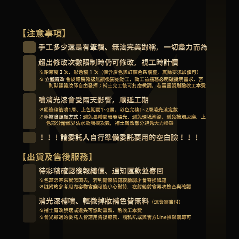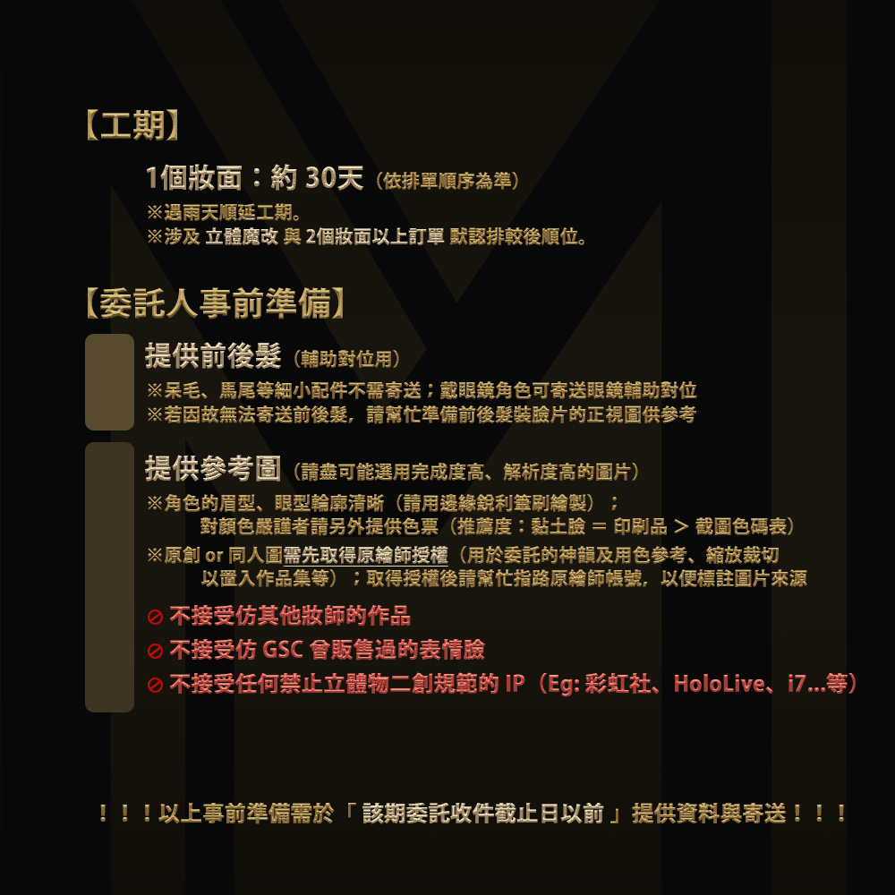 由於此期委託涵蓋了私人出遊(10/10~10/12)以及妝師生日假(11/12),休假期間無法受理委託相關事務,工期因而順延(反映在妝則內的第一批及第二批完工日時間點),還請見諒
