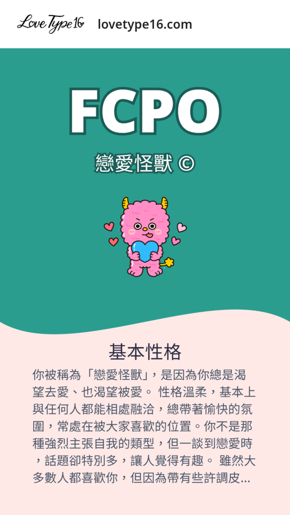 [ 戀愛十六型人格 ] 測驗結果: FCPO-戀愛怪獸