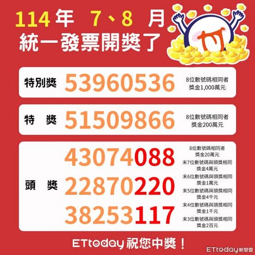 2025年統一發票7、8月中獎號碼出爐