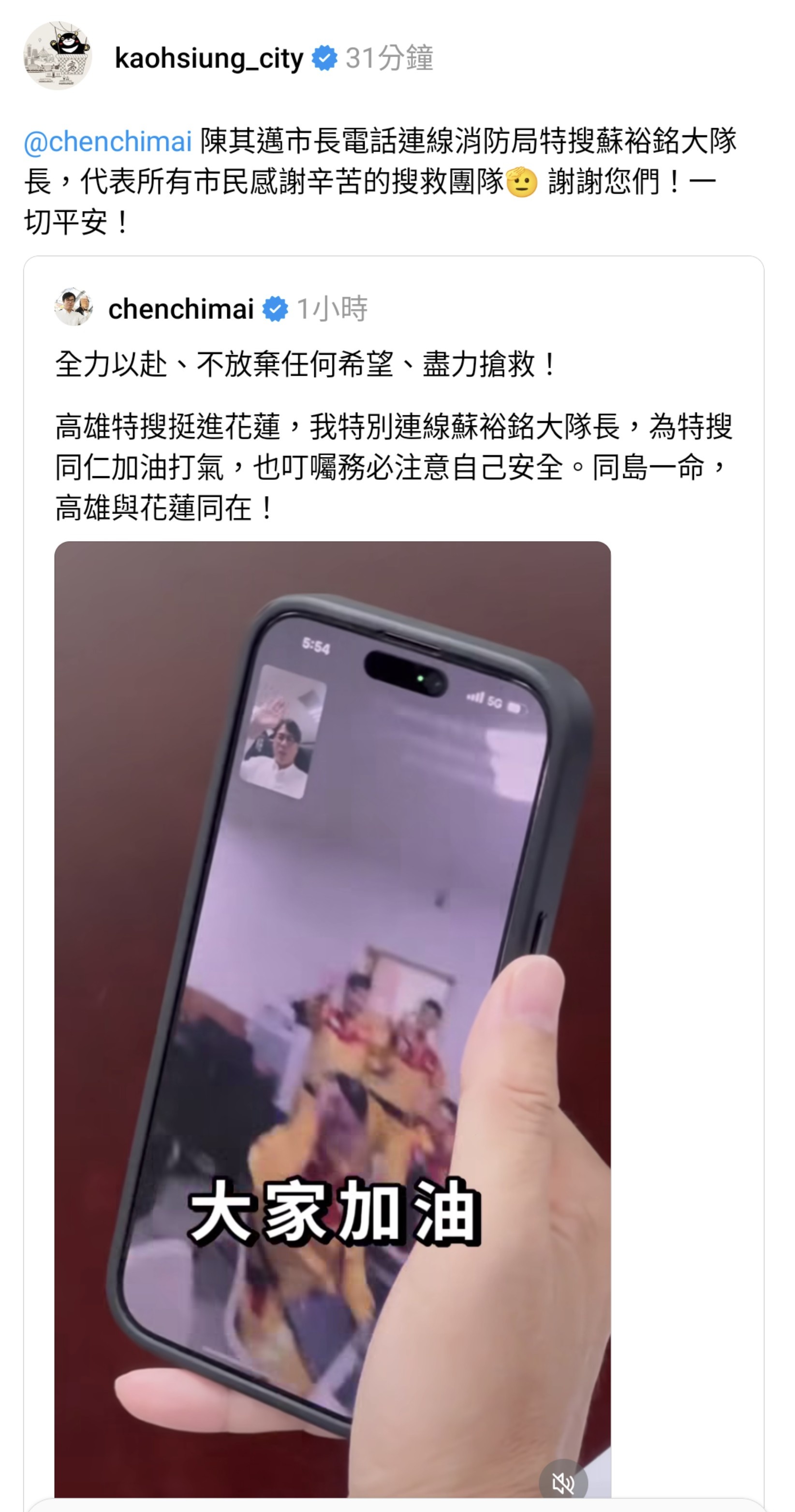 「高雄消防特搜大隊馳援,歷時6天搜救,完成32項任務,團隊今天返回高雄。市長陳其邁到場迎接慰勞,宣布所有救災人員公假補休2天。」