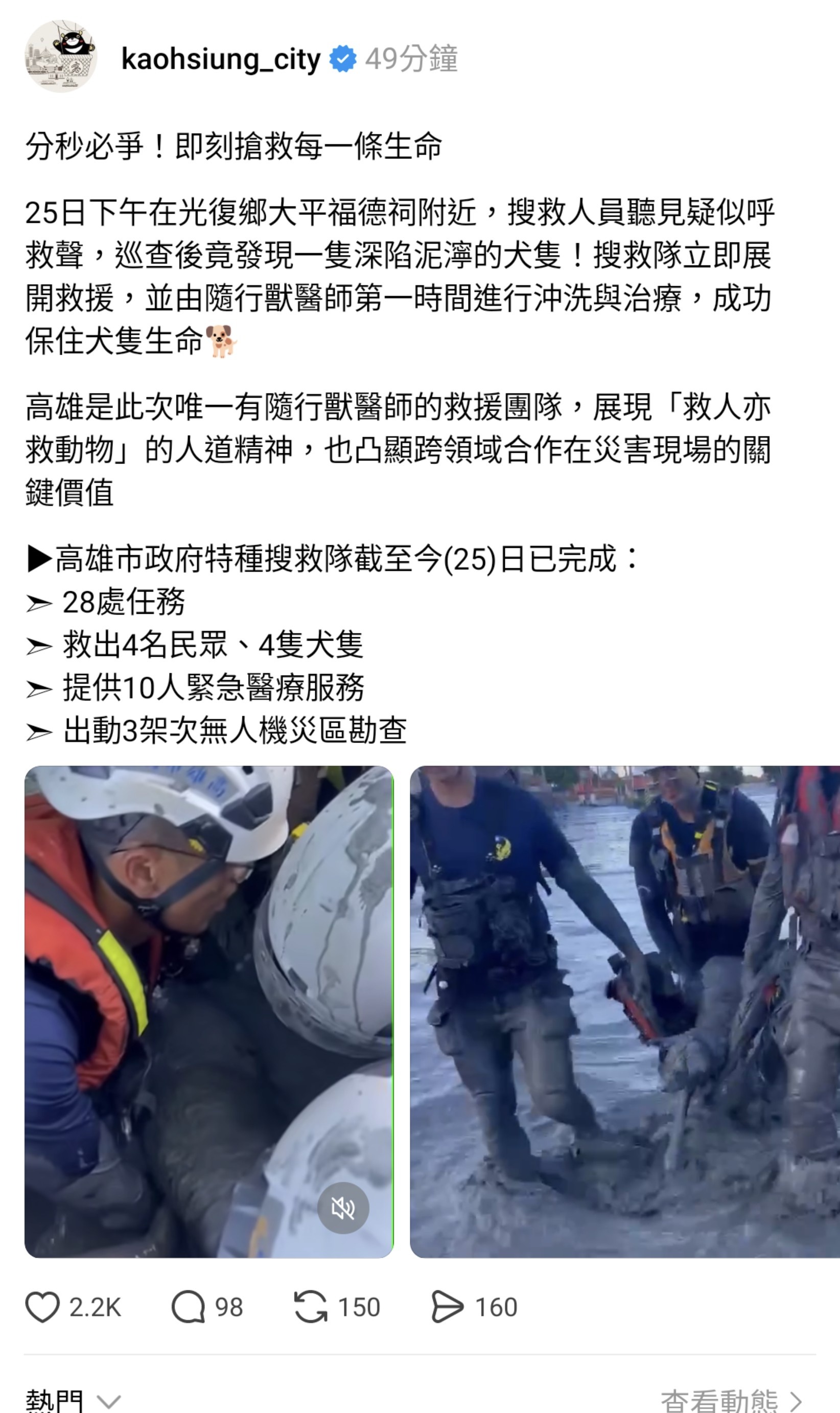 「花蓮縣光復鄉馬太鞍溪堰塞湖溢流釀災,高雄市政府消防局特種搜救隊持續動員17輛救災救護車輛、45名搜救人員(包含警消38人、義消3人、醫師1名、護理師2名、獸醫師1人)、5隻搜救犬、8艘救生艇及2台無人機,投入災後緊急救援工作。