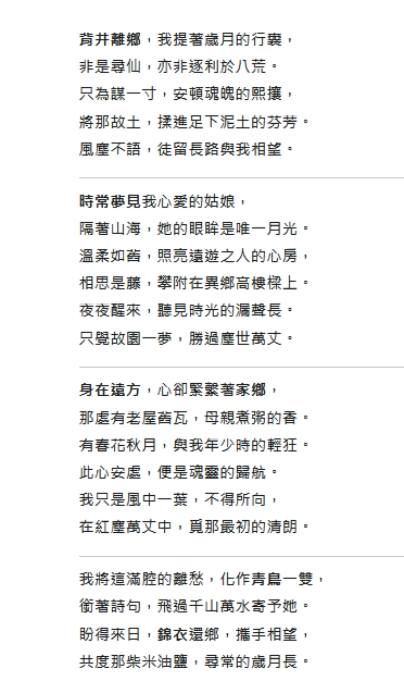 夜夜醒來,聽見時光的漏聲長。 只覺故園一夢,勝過塵世萬丈。 身在遠方,心卻緊繫著家鄉, 那處有老屋舊瓦,母親煮粥的香。 有春花秋月,與我年少時的輕狂。 此心安處,便是魂靈的歸航。 我只是風中一葉,不得所向, 在紅塵萬丈中,覓那最初的清朗。 我將這滿腔的離愁,化作青鳥一雙, 銜著詩句,飛過千山萬水寄予她。 盼得來日,錦衣還鄉,攜手相望, 共度那柴米油鹽,尋常的歲月長。