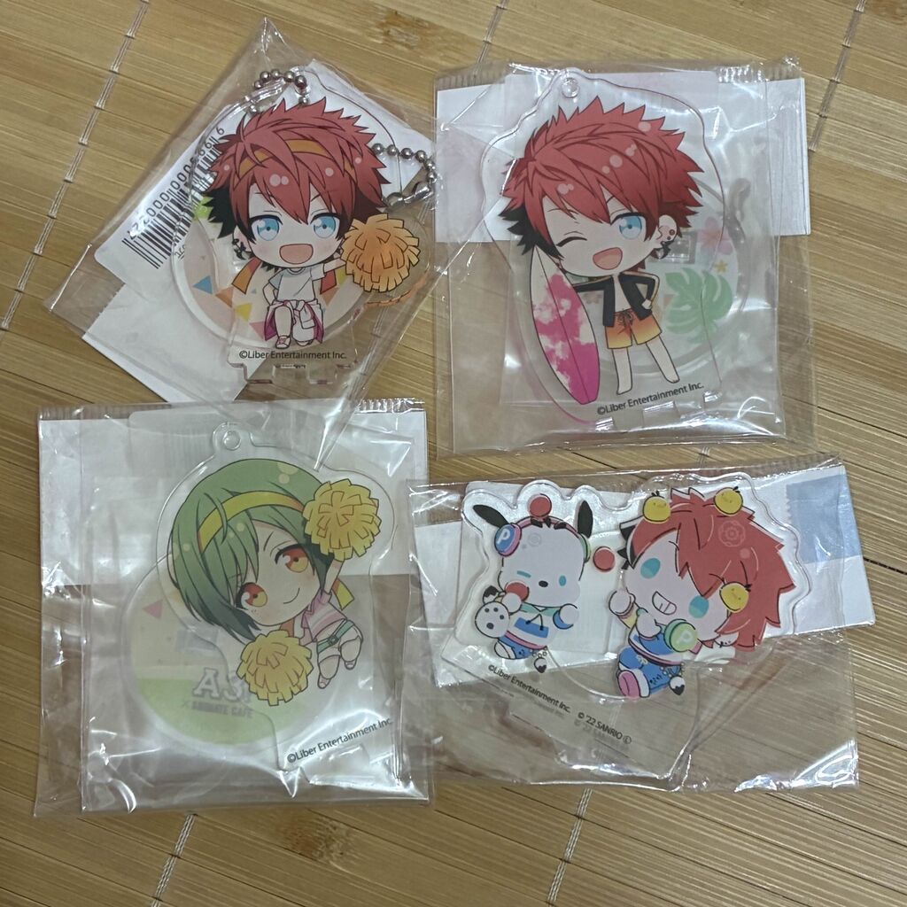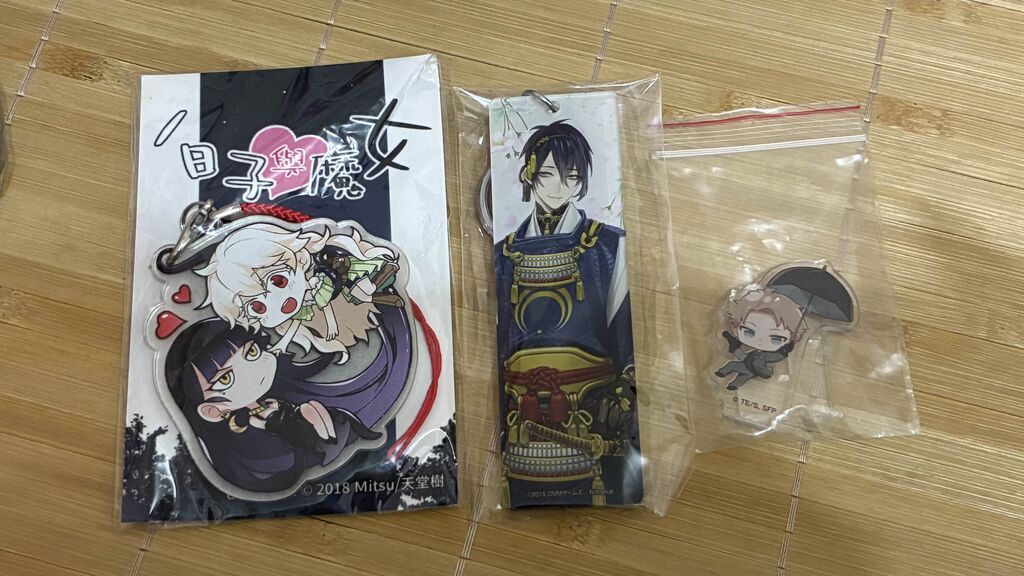 23.同人原創吊飾(左)50 / 官方刀劍亂舞三日月吊飾(中)100 / 官方間諜家家酒黃昏小立牌(右,從日本大創盲抽回來的,無原包裝)50