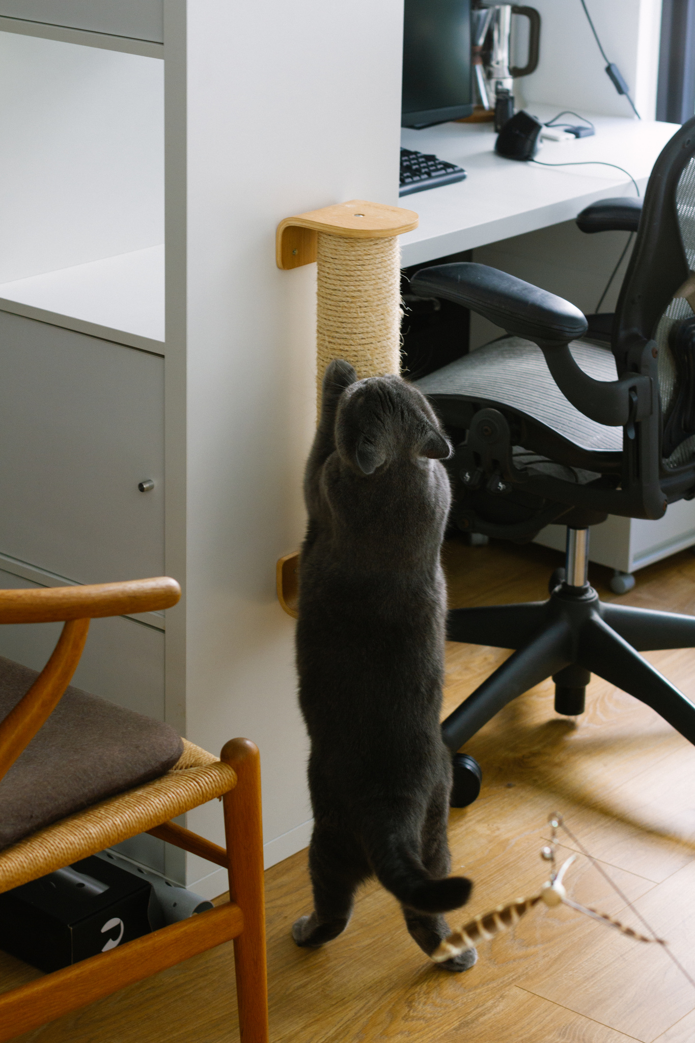 這款是我目前買過貓最捧場的磨爪用品,100%天然劍麻製作,固定在牆上穩定性十足,抓爛了還有替換柱可另購。裝在通道貓經過就會順手抓抓,挨罵的時候也會去抓兩下洩憤,上完廁所需要宣洩解便嗨也抓。
