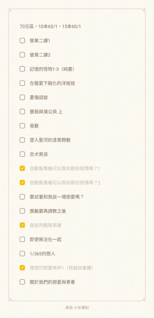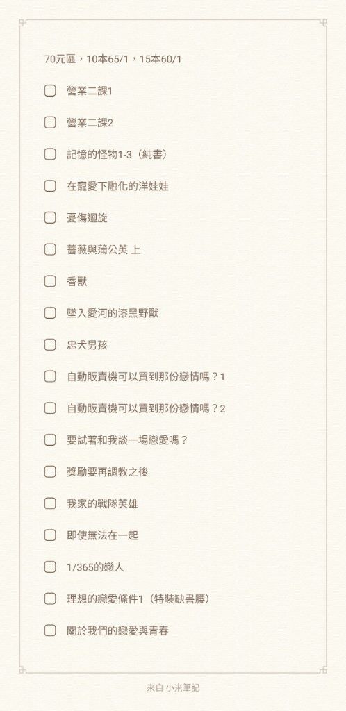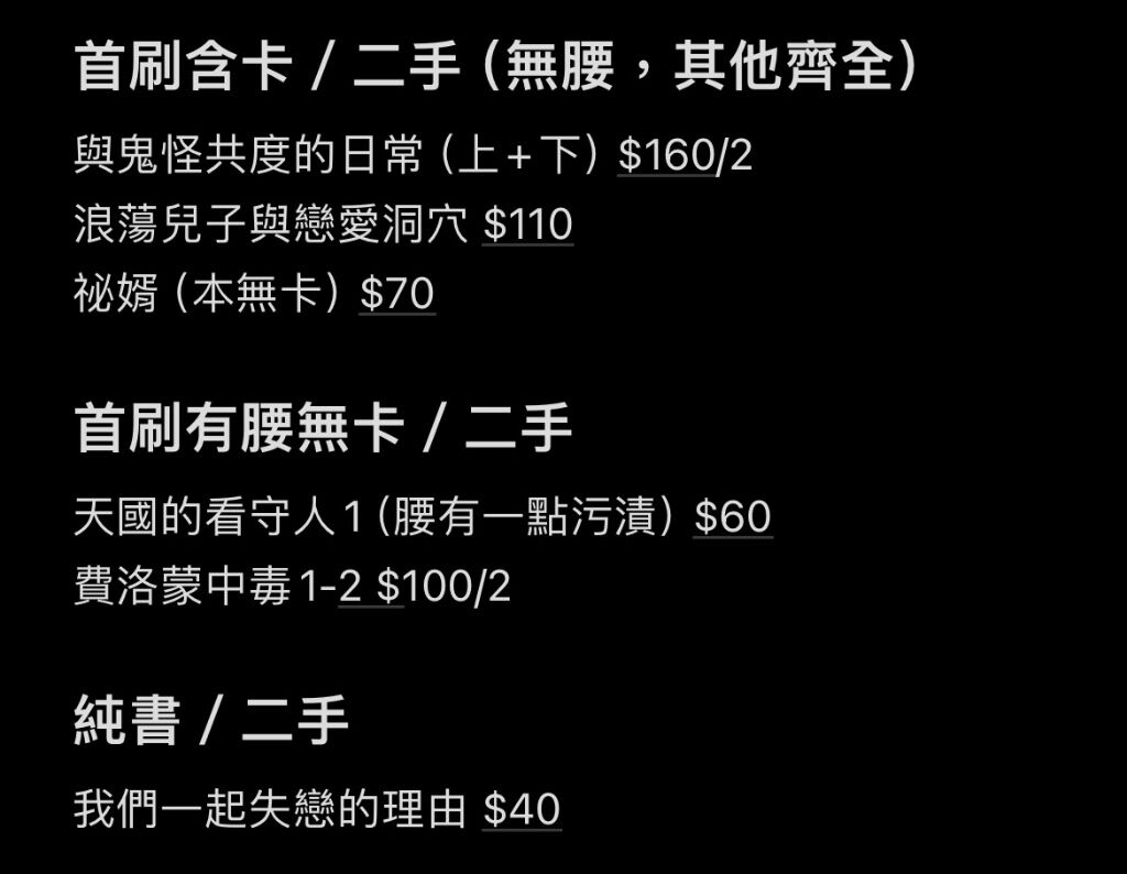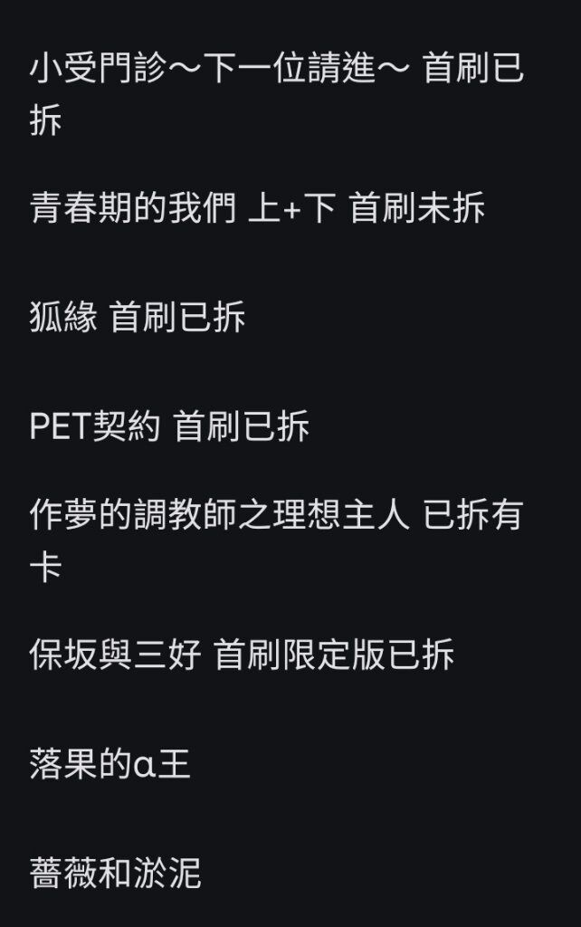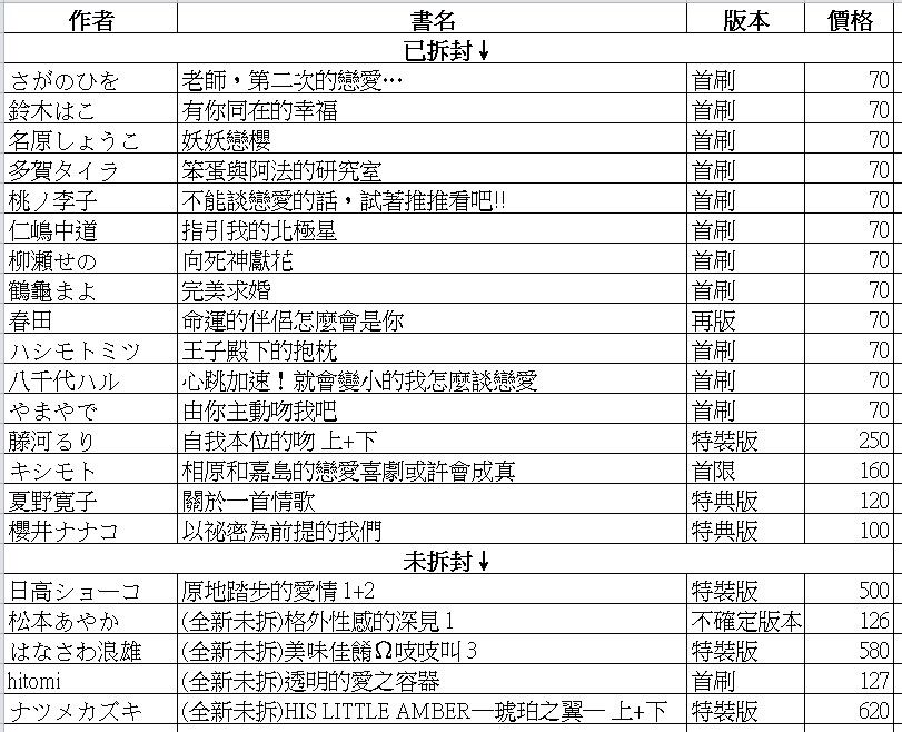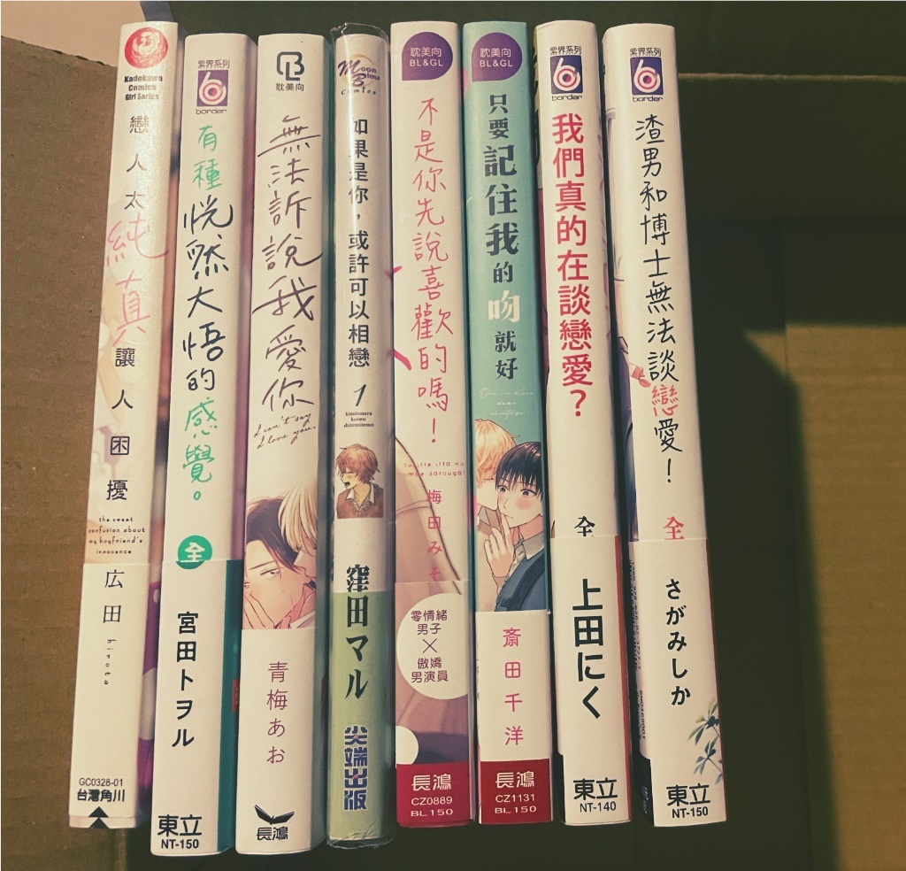 最近還想再放幾本進去,多放幾本可以平均100,不知道噗主有興趣到多大盤這邊有幾本是尚未完結作品,不會只有中間集數(因為都只有買第一集而已⋯),但如果很介意的話會抽掉