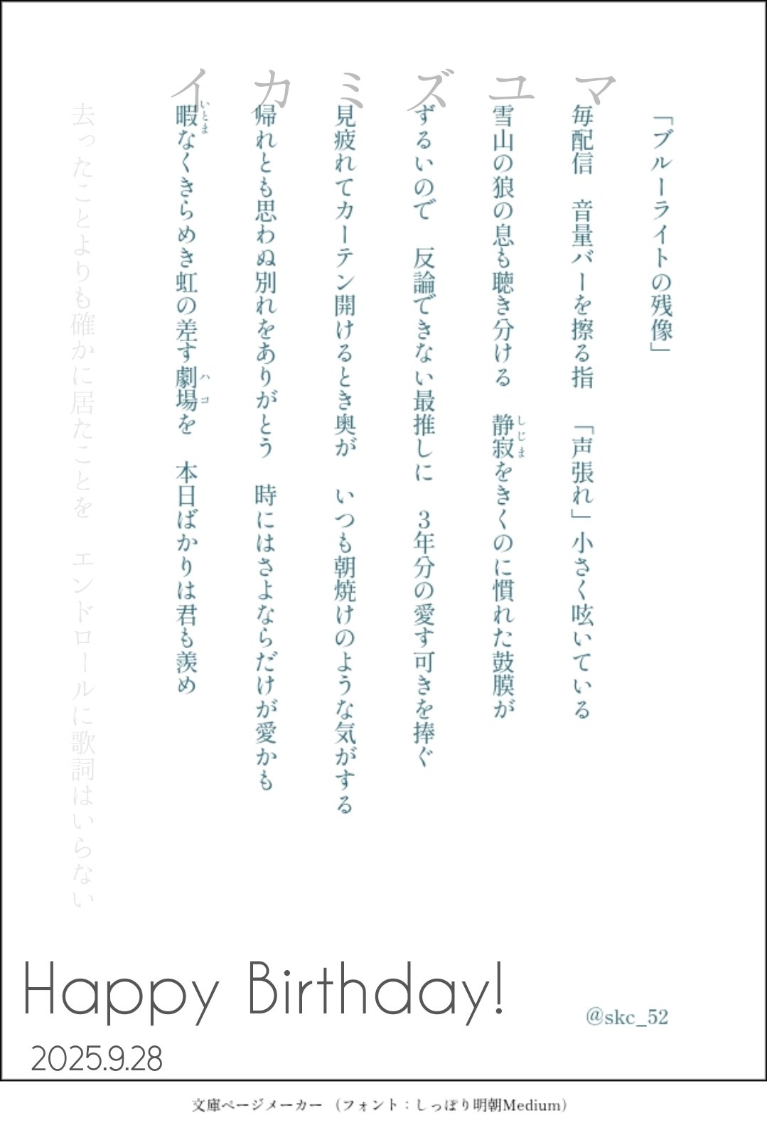 作者真的很強,還有設計藏頭,每句第一個假名連起來就是「マユズミカイ」,黛灰的名字。作者也有在圖片上用淺灰色標出來,和歌字體顏色也是選用黛灰的代表色。從設計到內容都感受到作者的用心。