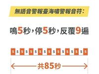「行政院發言人李慧芝晚間表示,針對花蓮馬太鞍溪堰塞湖河床狀態,農業部林保署持續監測中,若有任何緊急狀況需要疏散撤離,內政部警政署將比照海嘯警報播放方式,以短鳴5秒、停止5秒、再短鳴5秒,共15秒、循環9次方式播放,希望讓當地居民、志工及協助救援重建者知曉、警覺。