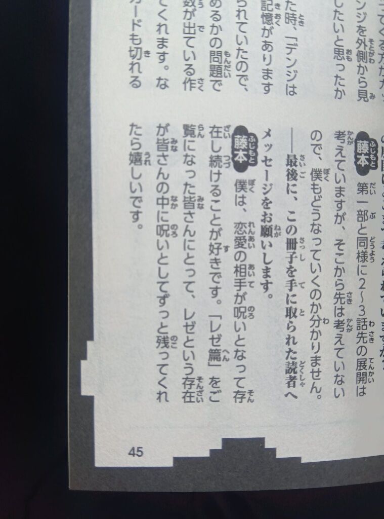 我喜歡讓戀愛對象以詛咒的形式持續存在。如果大家看過『蕾潔篇』之後,能讓蕾潔這個存在像詛咒一樣一直留在你們心中,那我會很高興。