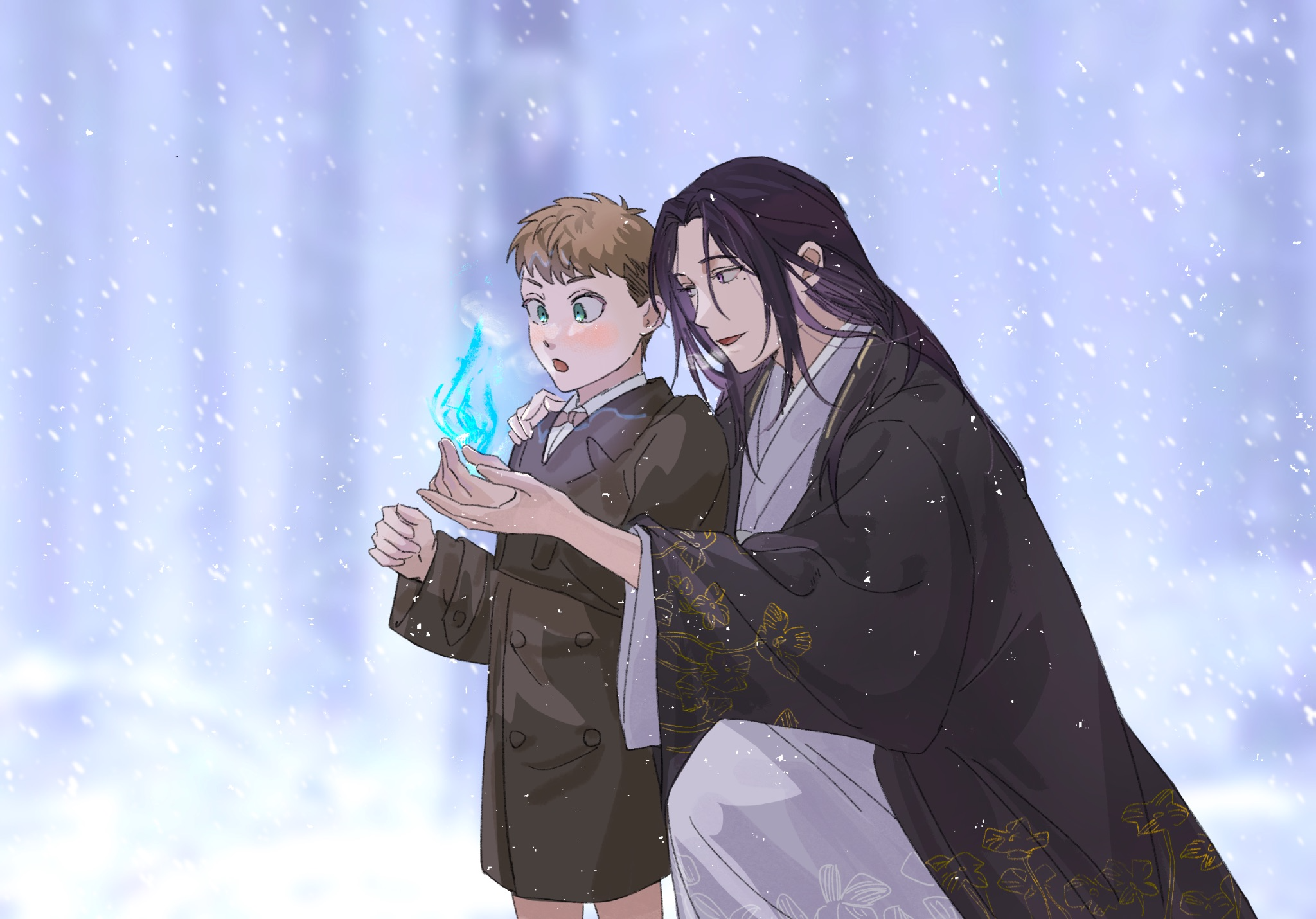 藍色魔法火焰的光源照亮兩人的臉,真的好好看⋯⋯我特別喜歡小亞莫的眼睛裡的火焰反光,還有他衣服上的藍色光暈,美得要死,我也要死了