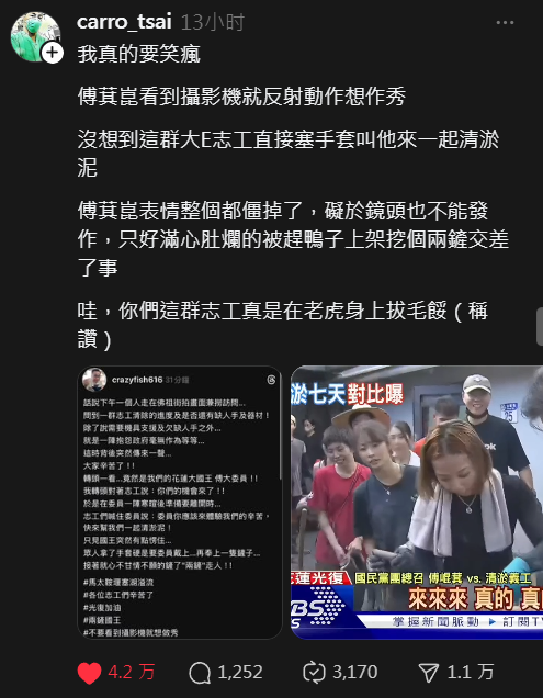 傅萁崑看到攝影機就反射動作想作秀,沒想到這群大E志工直接塞手套叫他來一起清淤泥。