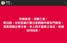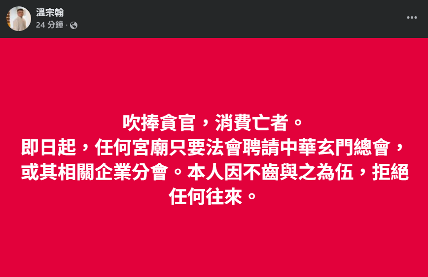 溫宗翰:吹捧貪官,消費亡者。即日起,任何宮廟只要法會聘請中華玄門總會,或其相關企業分會。本人因不齒與之為伍,拒絕任何往來。