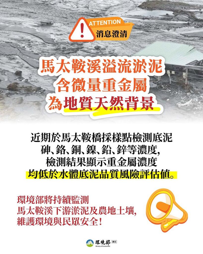 針對媒體報導的「馬太鞍溪堰塞湖溢流後重金屬」議題,環境部澄清如下,請民眾不必擔心: