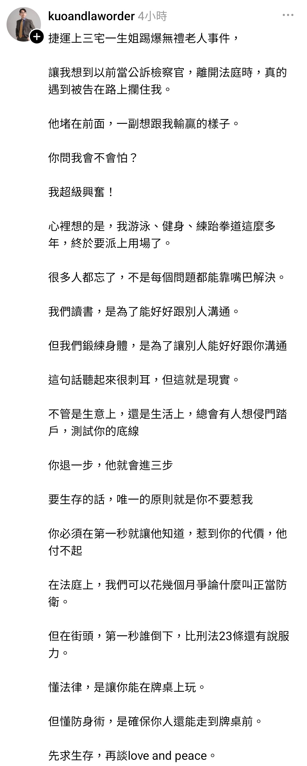 話說要是真的在捷運上遇到這種狀況要怎麼辦,我應該是做不到飛踢人這招,力氣不夠。所以我個人的話會直接拿手機開始錄影,然後大聲告知我現在在錄影,你剛剛講什麼要不要再講一次我錄下來放網路給大家看看?