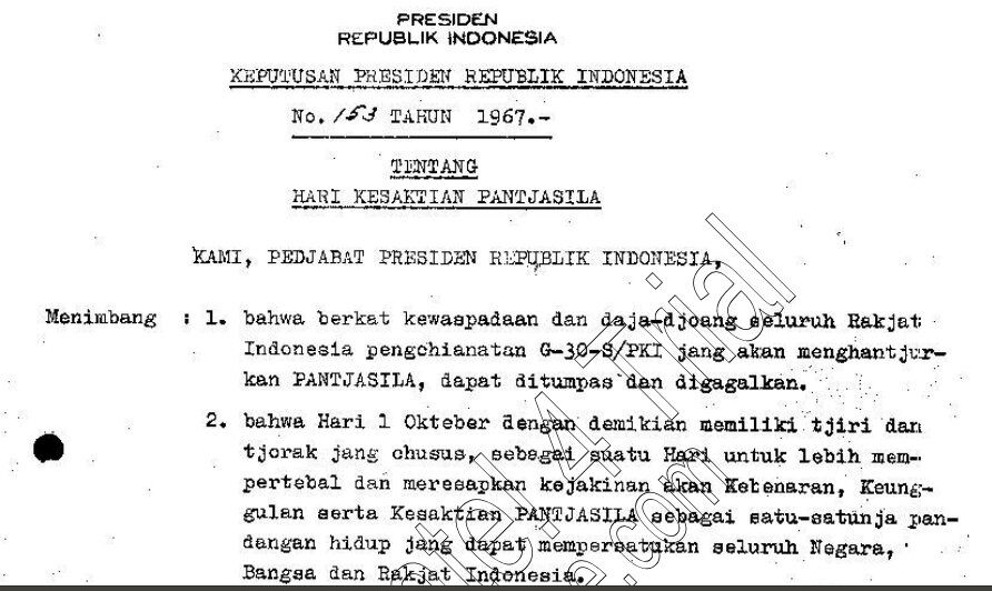 – Keputusan Presiden Republik Indonesia No. 153 Tahun 1967 tentang Hari Kesaktian Pancasila