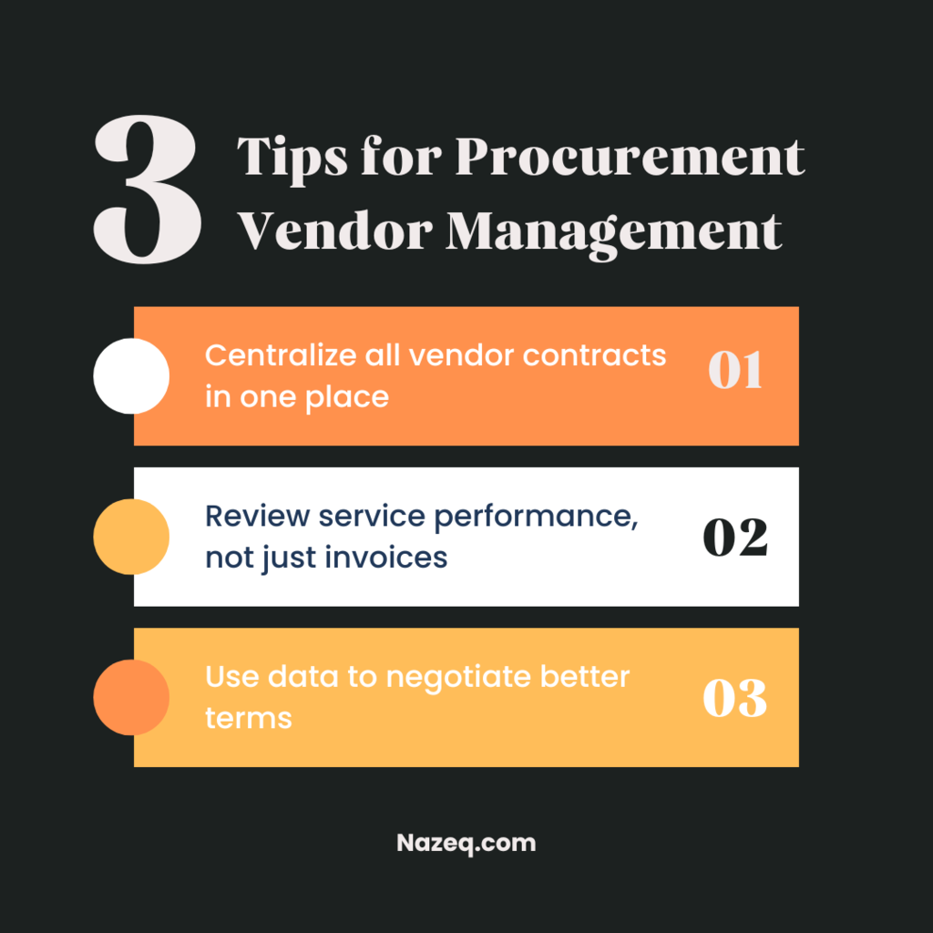 Managing vendors isn’t just about contracts—it’s about performance, results, and smarter decisions. With Nazeq, these steps are streamlined and done for you.