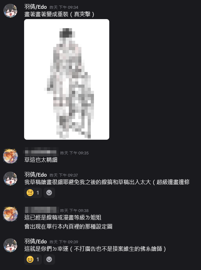 Hmmm……嚴格來說我給委託人的草稿都是清過ㄉ,一方面是避免和線稿出入太大會有爭議(很有自覺會邊畫邊大改的人)、另方面是雜線太多太粗的話我會找不到要畫哪裡,所以配件越多的我的草稿就會越細