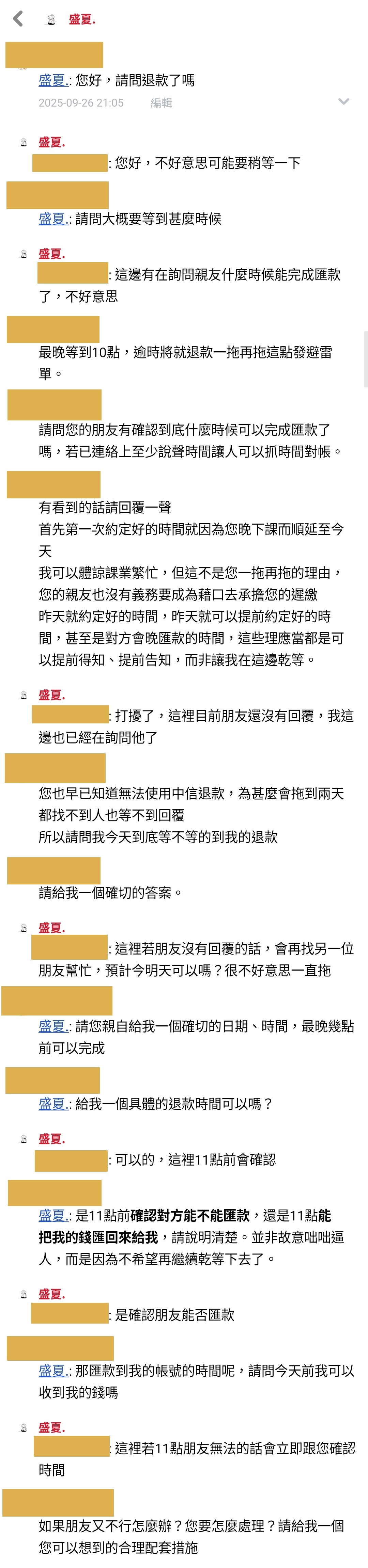 7.直至9/26 21:05,我方詢問是否退款,得到賣家需要稍等的回覆,因為「有在詢問親友什麼時候能完成匯款」。我方認為這件事情本該可以提早處理,故於21:20留言「最晚等到10點,逾時將就退款一拖再拖這點發避雷單。」