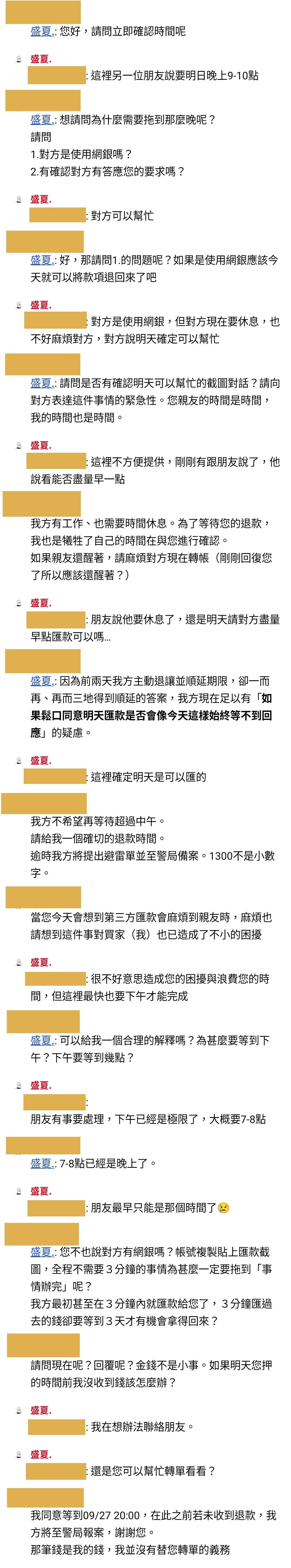 賣家認為現在問朋友會「打擾到對方」,因此仍然未收到退款。最後我方訂下09/27 20:00前未退款將至警局備案(不好意思應該是報案,當時在氣頭上沒來的及修正,於此也因為還原對話內容故保留原先用法)的最後期限。