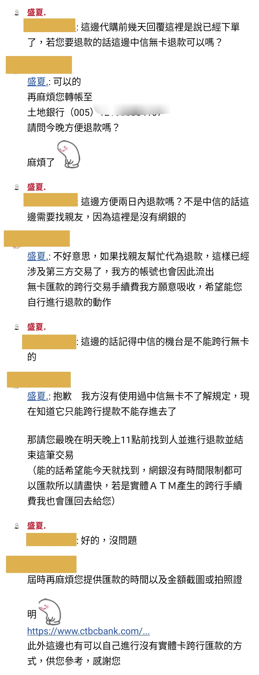 5.賣家供稱僅能使用「中信無卡」,由於我方未持有中信帳戶,故賣家找親友代為退款。