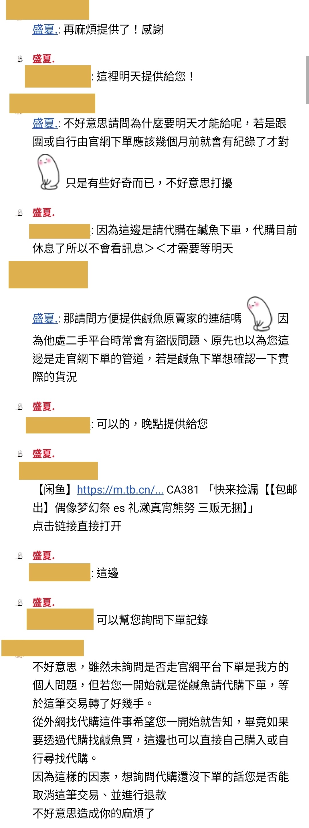 4.經賣家自述,自己是委託代購去「鹹魚」平台購入,而非由官方網站下單。由於對貨源不放心、且賣家在交易初始便未主動告知,故我方主動提出取消交易,並請對方退款。