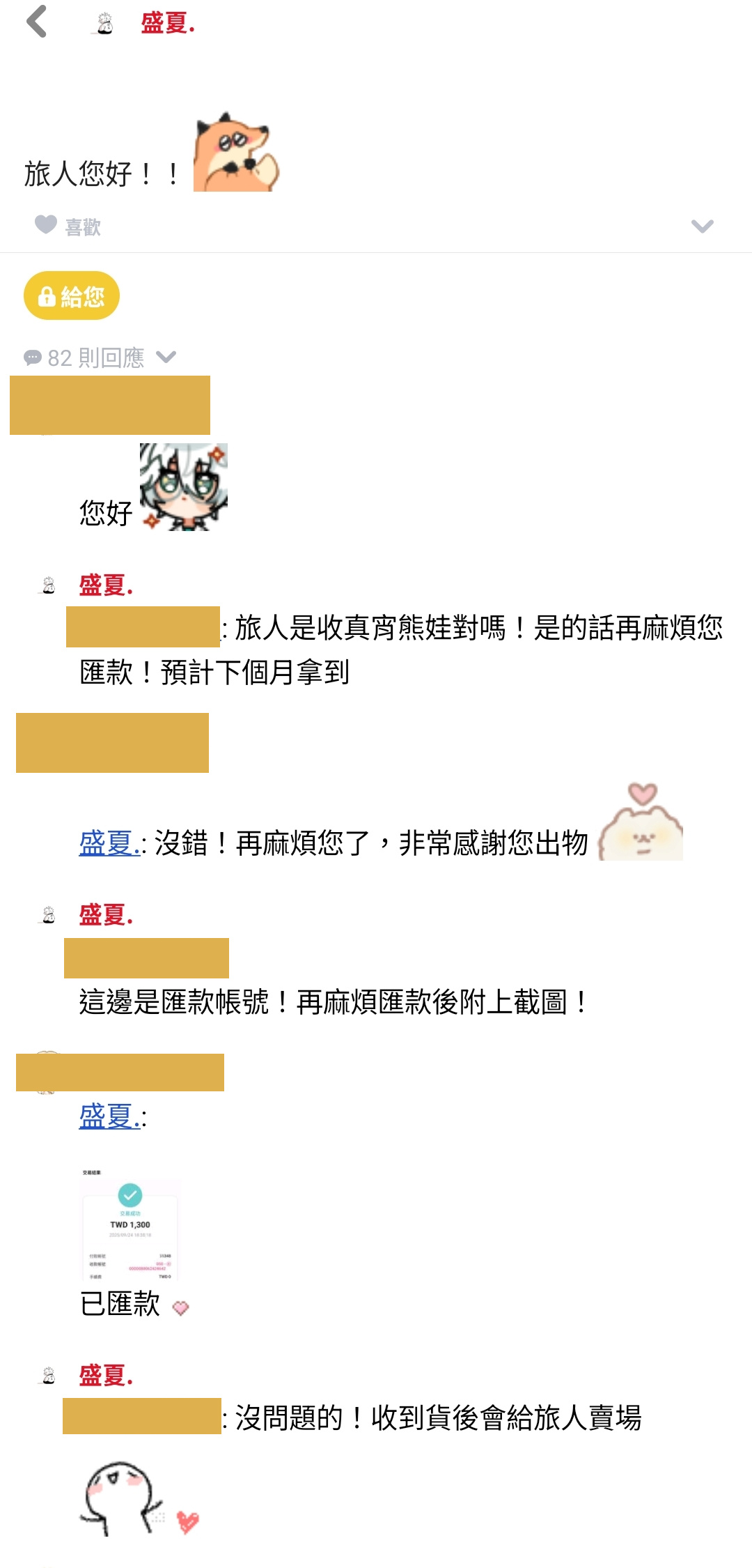 (在「下個月到貨」到「有遞友邀」間刪除的是我方喊收並留下帳號的留言)