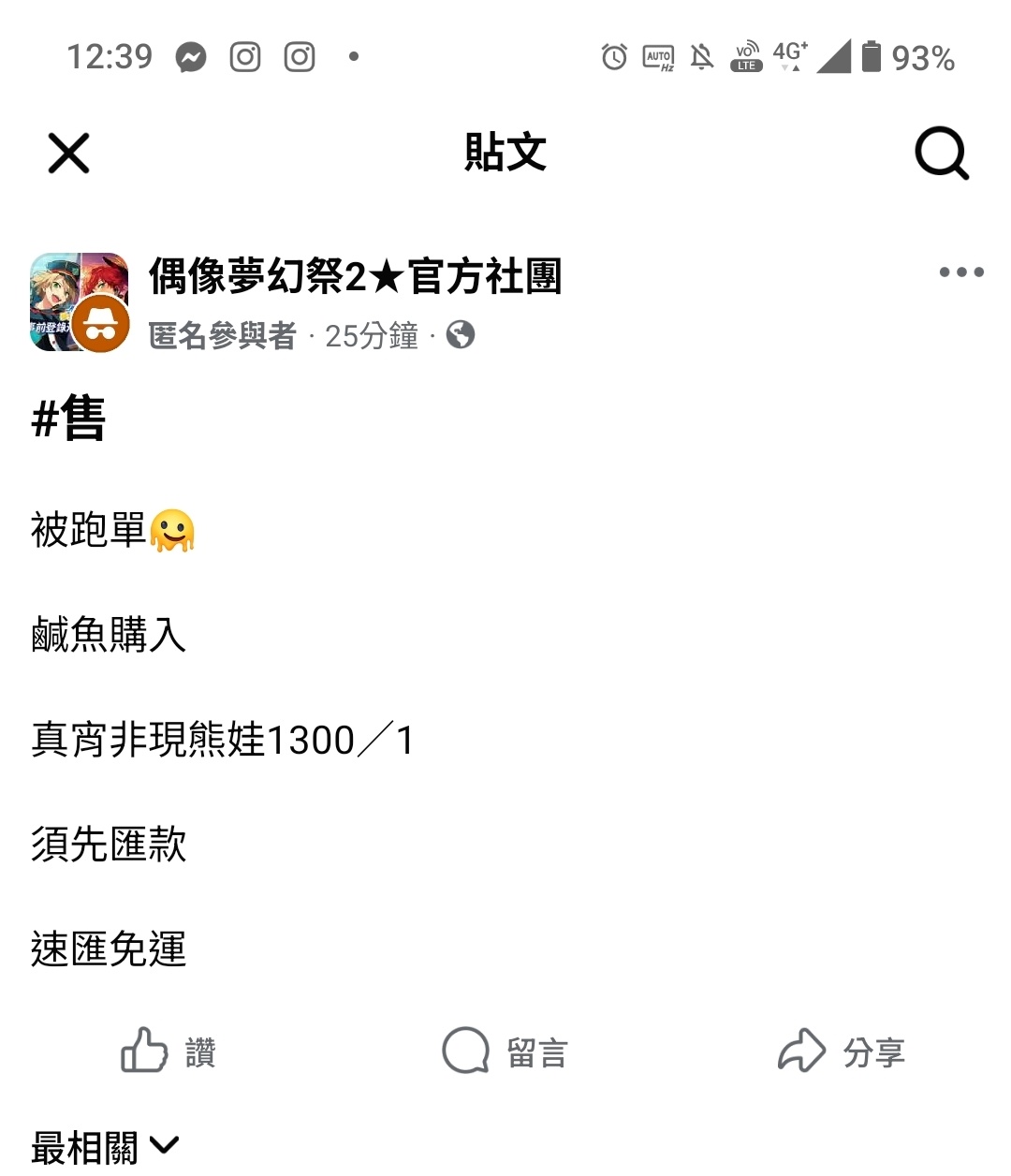 ?.存疑:所謂的「尋找朋友」疑似是從官方社團的交易文尋找下一位買家(官方社團貼文截圖時間:9/27 01:39),但此匿名貼文po出後不久便已刪文。