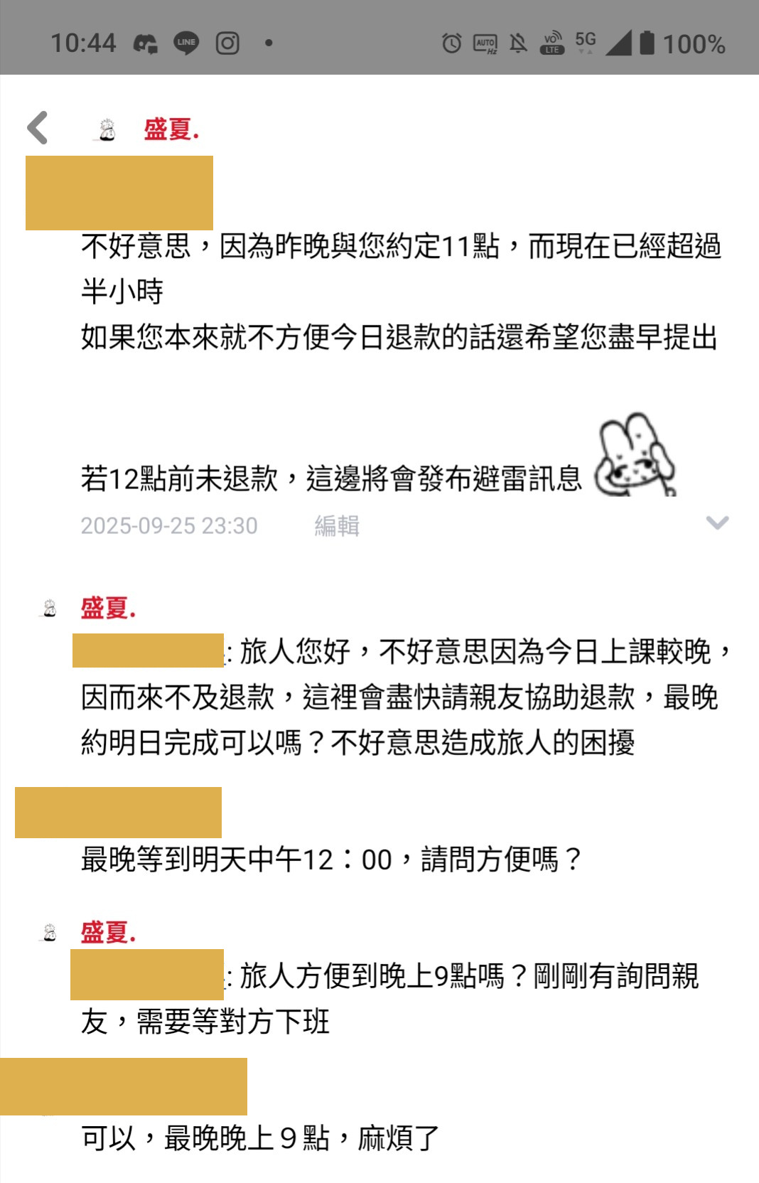 6.我方與對方約定9/25 23:00完成退款,於當日23:30仍未收到退款故前去詢問,得到賣家「因為今日上課較晚,因而來不及退款」的理由。本想過9/26 0:00後發佈避雷,但經過協商後同意將退款期限延期到9/26 21:00。