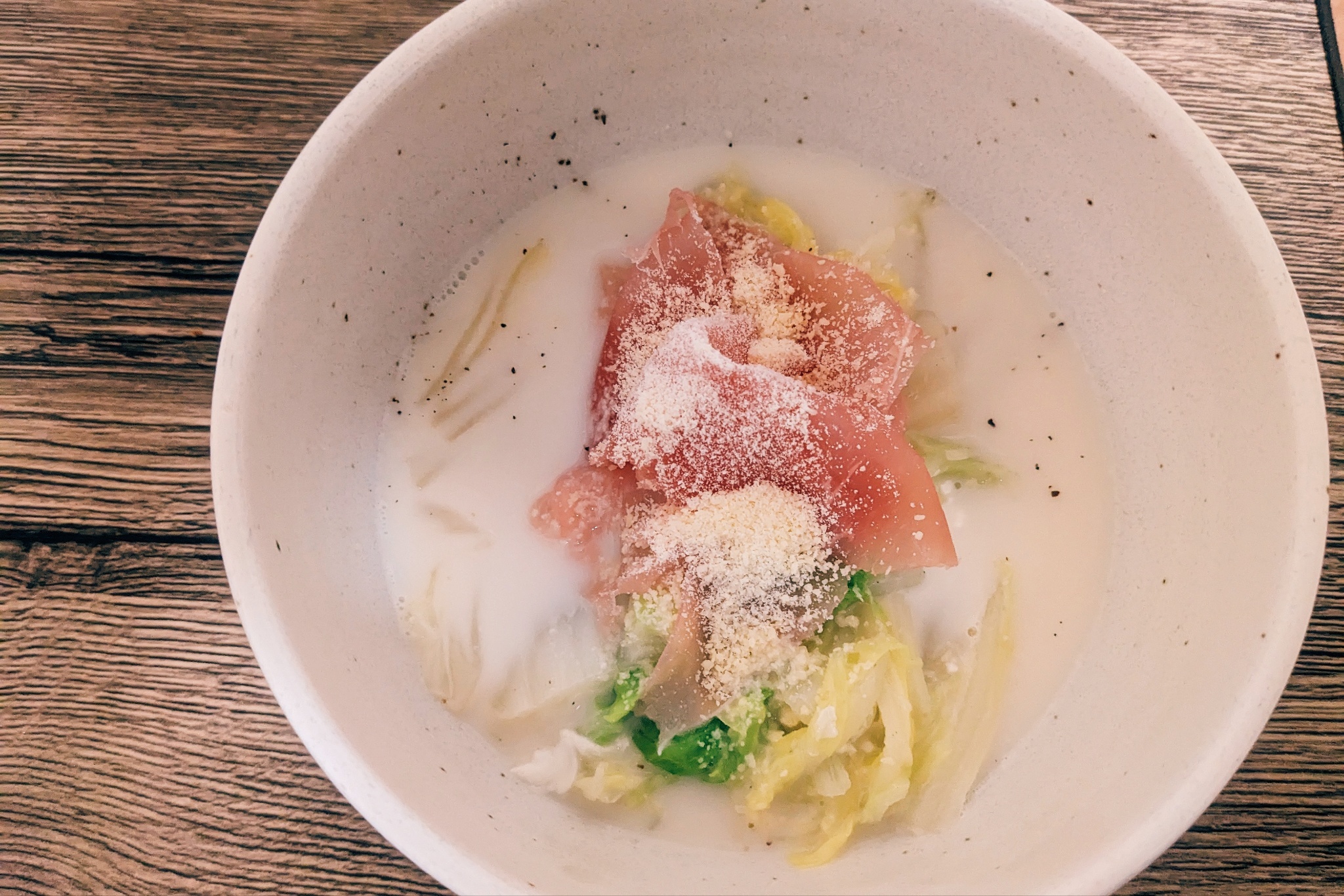 雞湯煮白菜加蛋生火腿牛奶起司粉 這時間的晚餐也沒什麼選擇