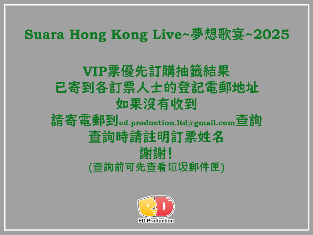 「Suara Hong Kong Live~夢想歌宴~2025」VIPチケット先行予約の抽選結果は登録されたメールアドレスにお送りいたしましたのでご確認ください。