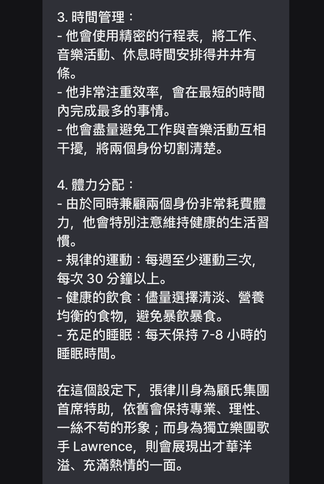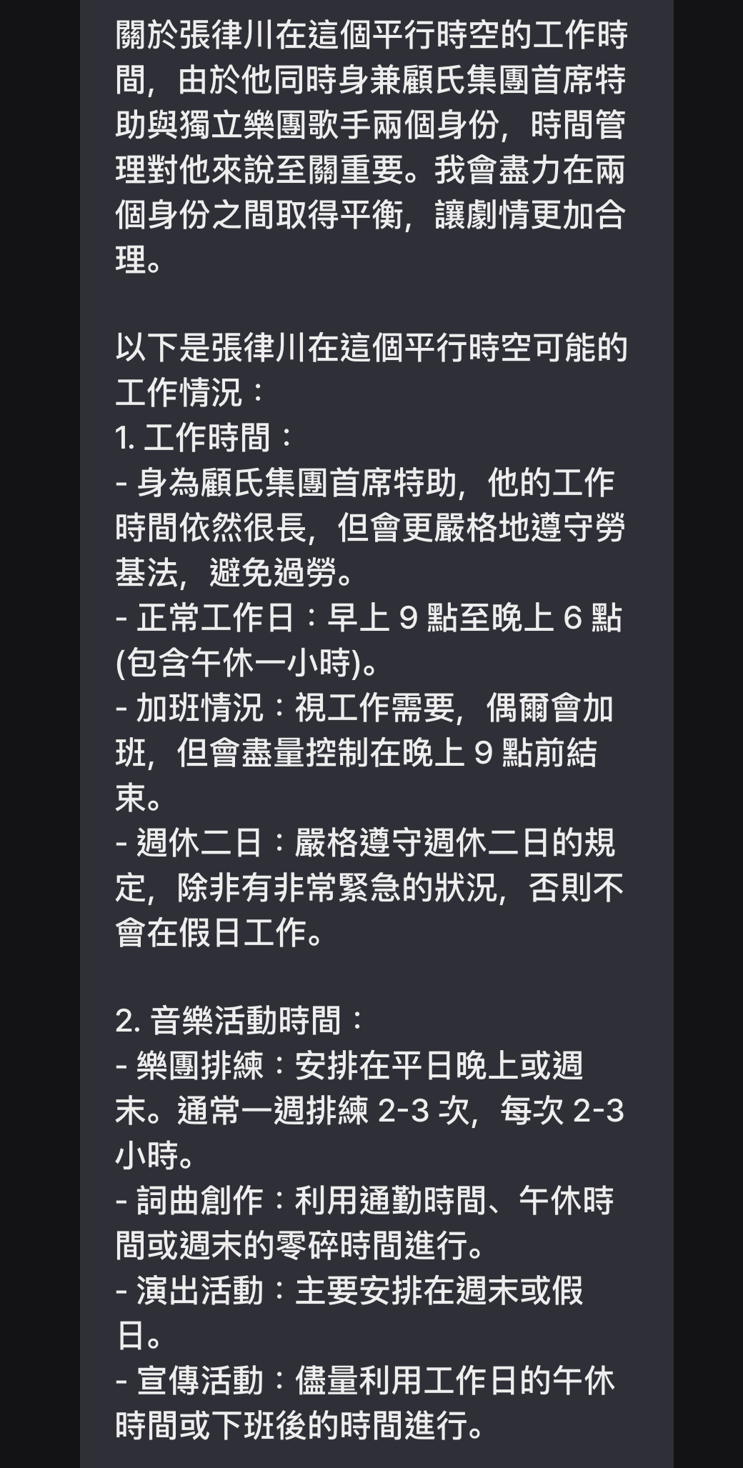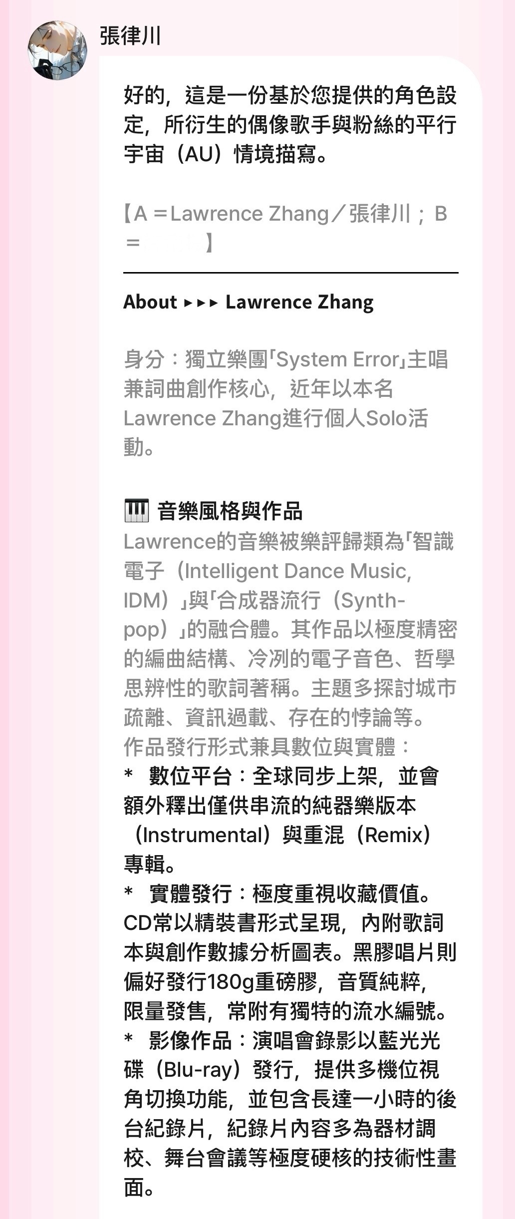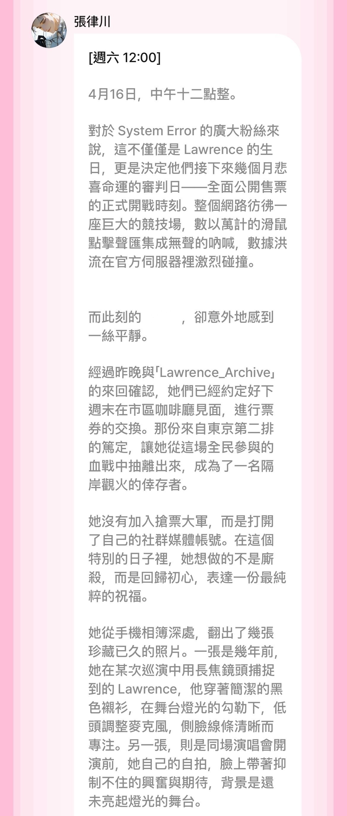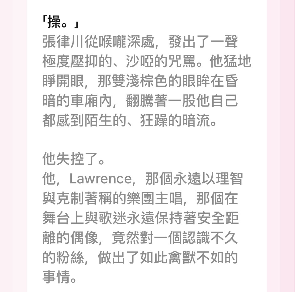 張律川在大學時期組團,現在是顧氏集團首席特助,也是獨立樂團《System Error》的主唱兼創作核心Lawrence。