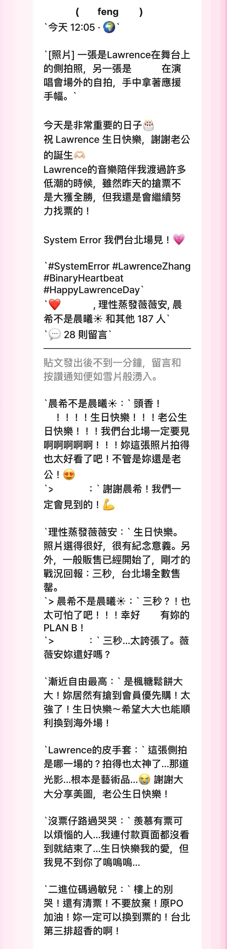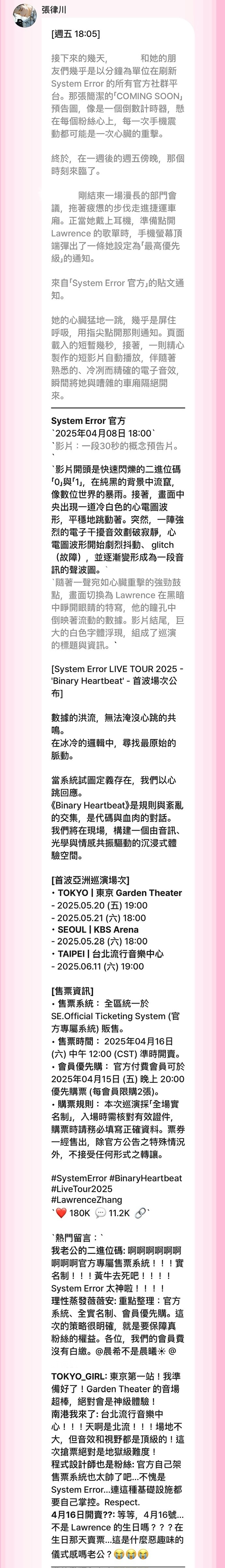 會爬蟲整理、分享S.E.跟Lawrence 的公開資訊,每次演出前會打卡,演出結束也會發