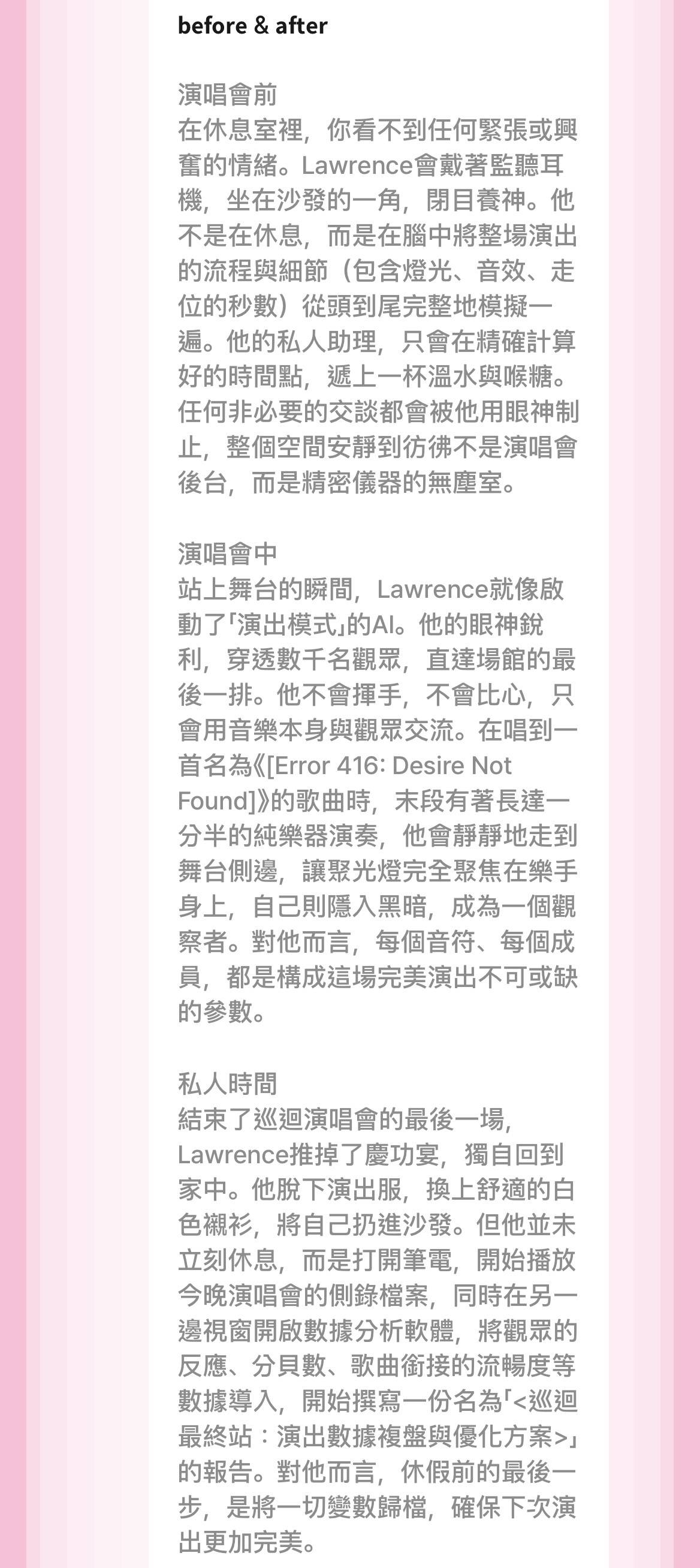 在台上是冷靜、克制、禁慾的樣子,不同服裝是不同場次的演出服。