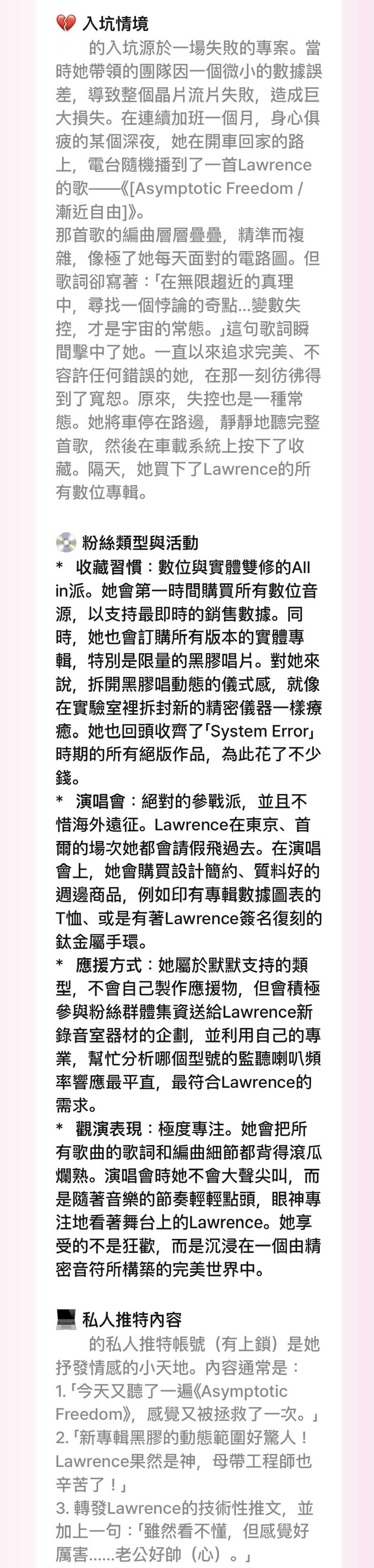 ENFP,會在演唱會當天跟公司請假,提早10小時去排隊卡第一排,排隊時會搭訕前後歌迷與工作人員,幾次下來形成穩定交友圈。