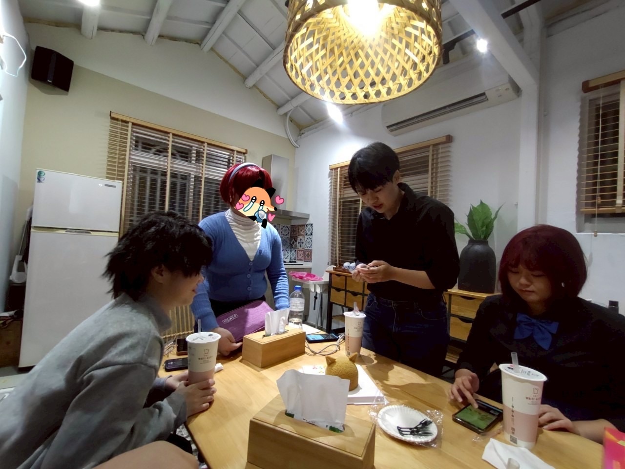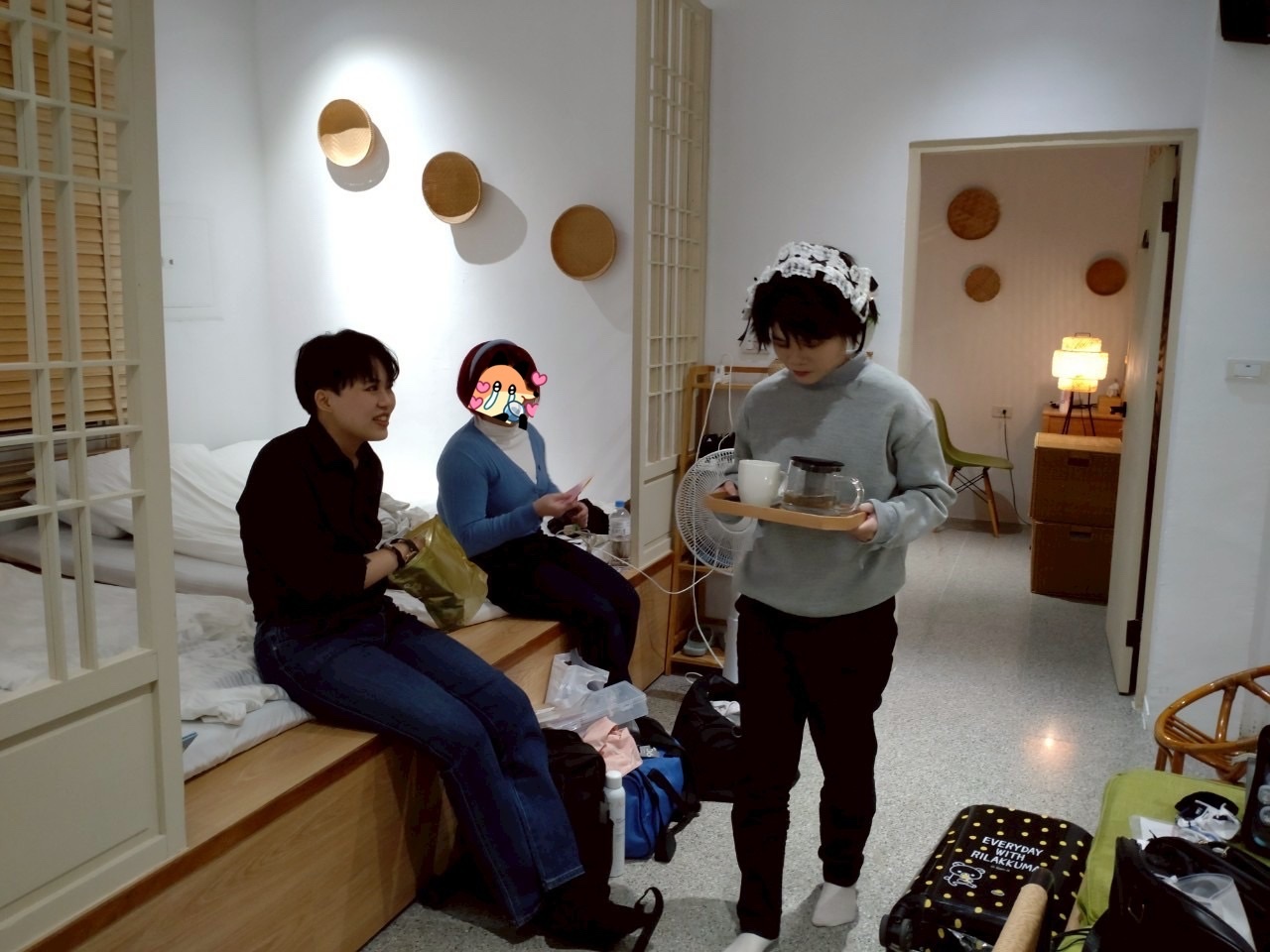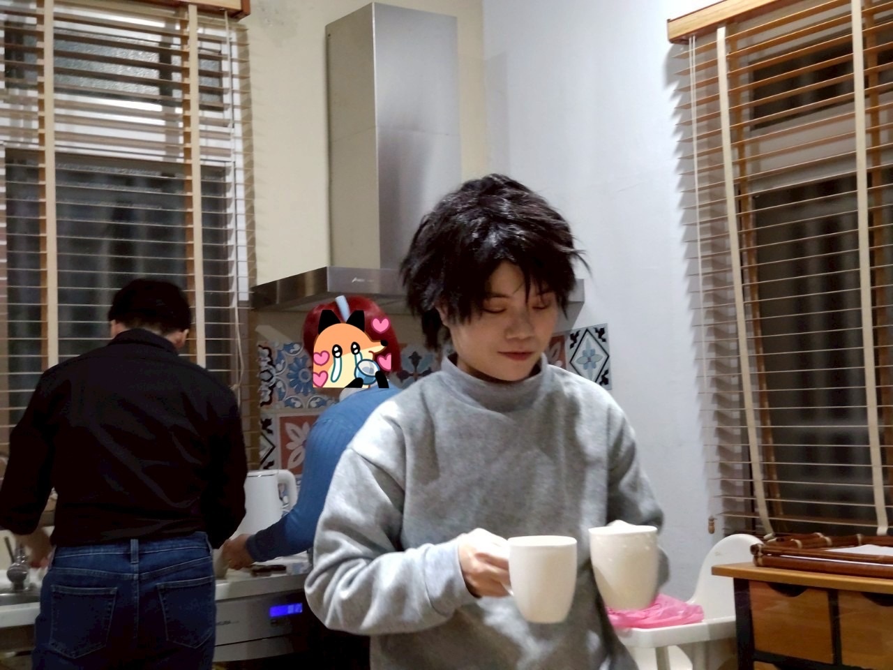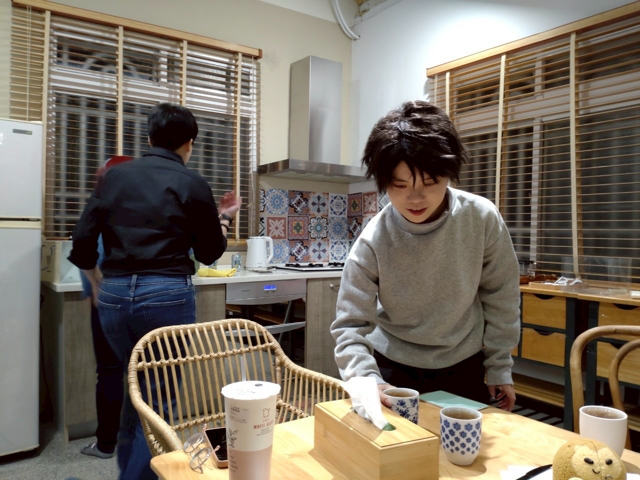 一進門大家開始研究燈在哪裡,然後我開始把能開的櫃子開一遍,得到筷子、杯子、碗之類的道具(乾